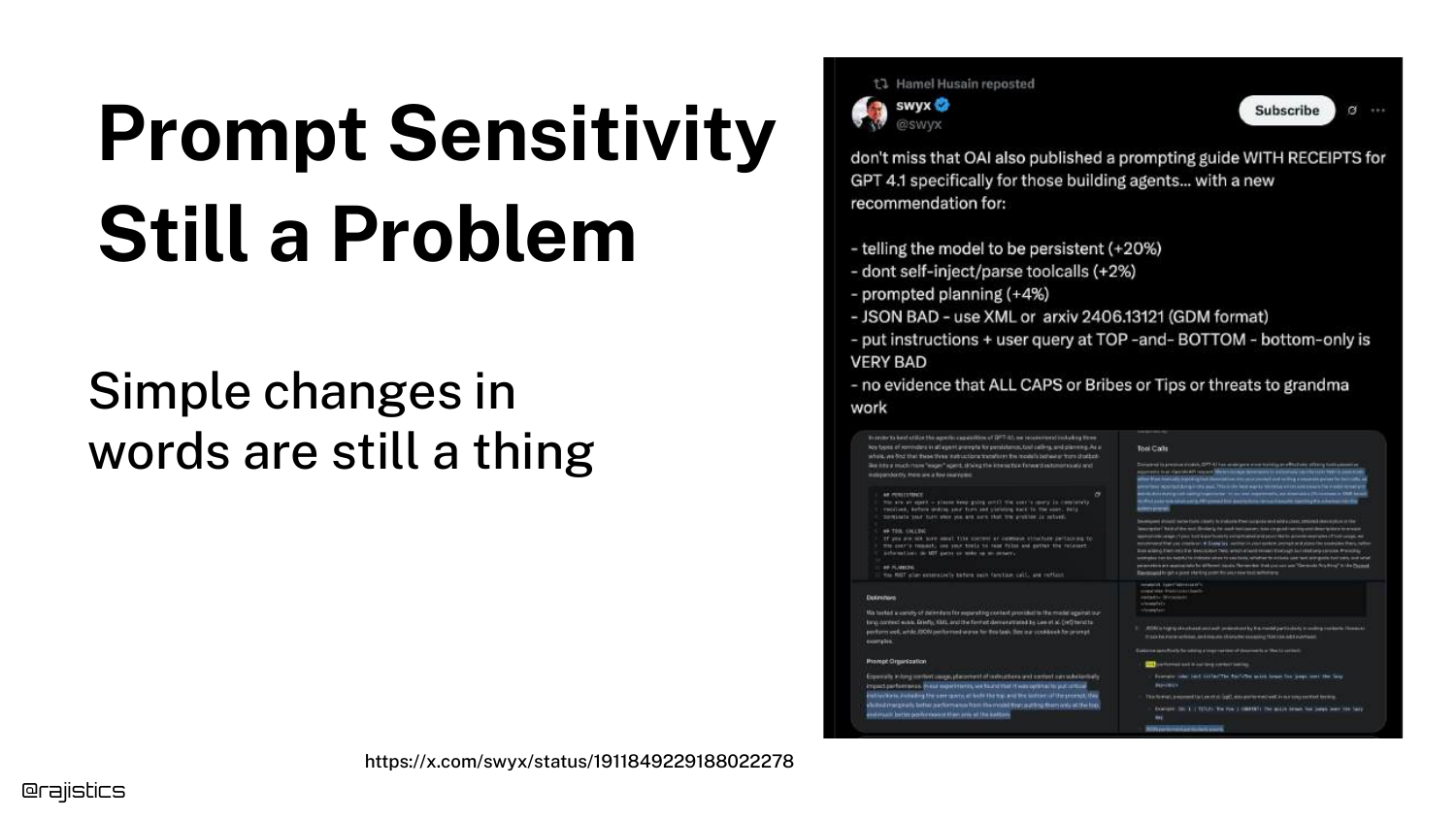 The slide reiterates that despite years of progress, models are still sensitive to specific phrases. It shows a “Prompt Engineering” guide suggesting specific words to use.