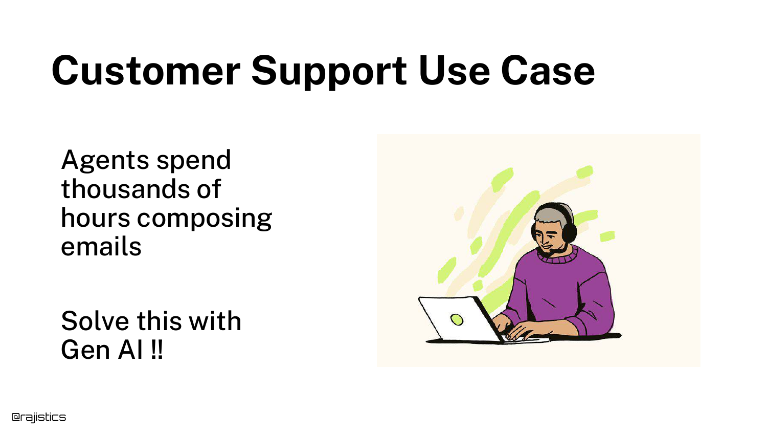 To motivate the need for evaluation, the presentation introduces a common real-world use case: Customer Support. Generative AI is frequently deployed to help agents compose emails or chat responses based on user inquiries.