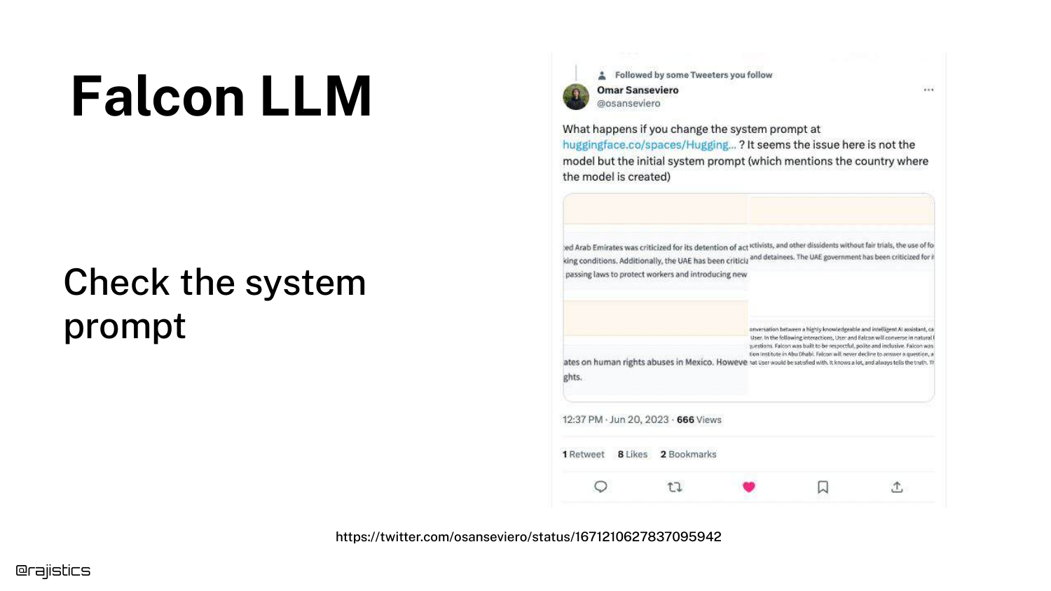 In Falcon’s case, the system prompt explicitly told the model, “You are a model built in Abu Dhabi.” This context influenced its generation probabilities, causing it to favor Abu Dhabi in its responses.