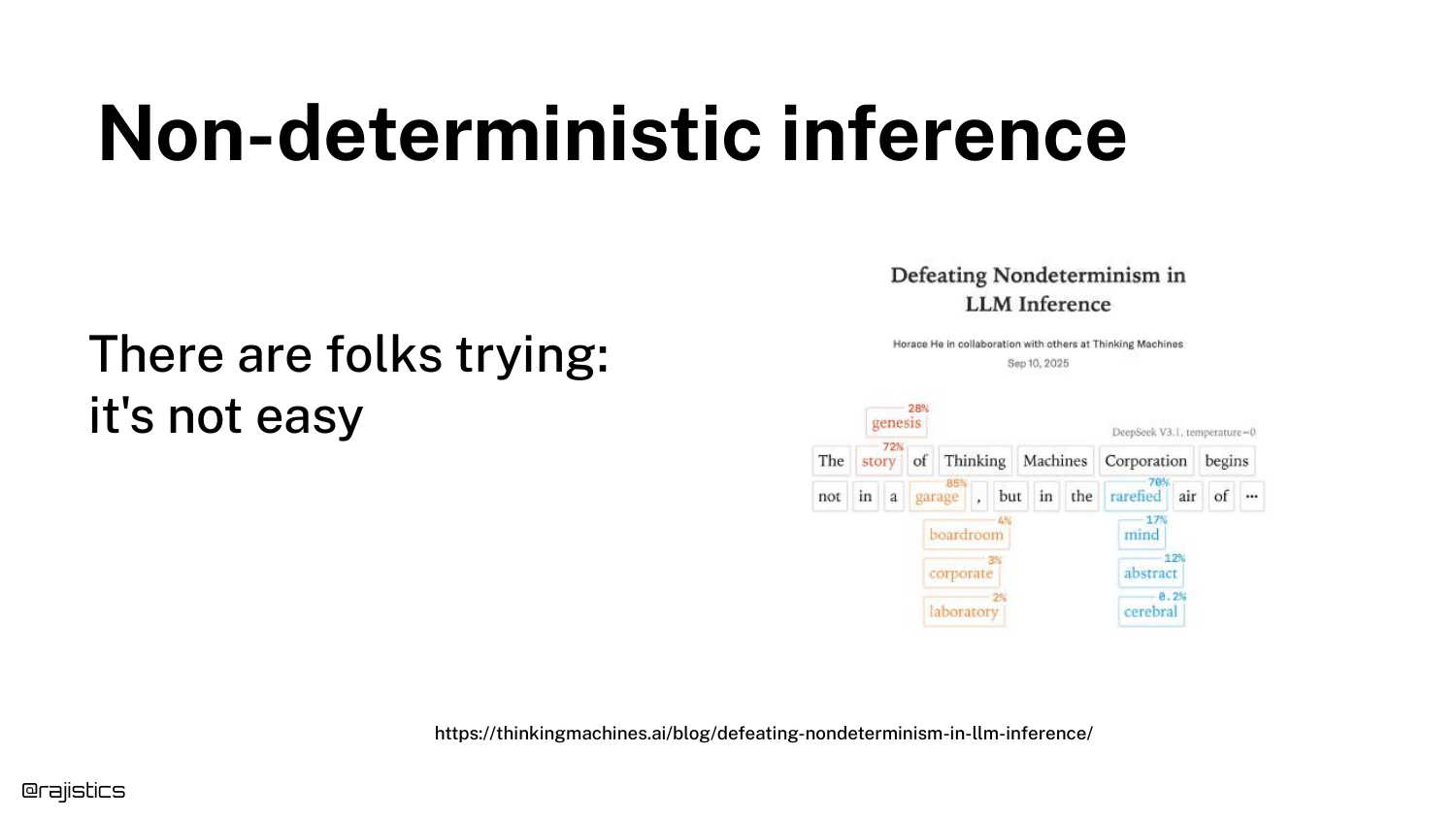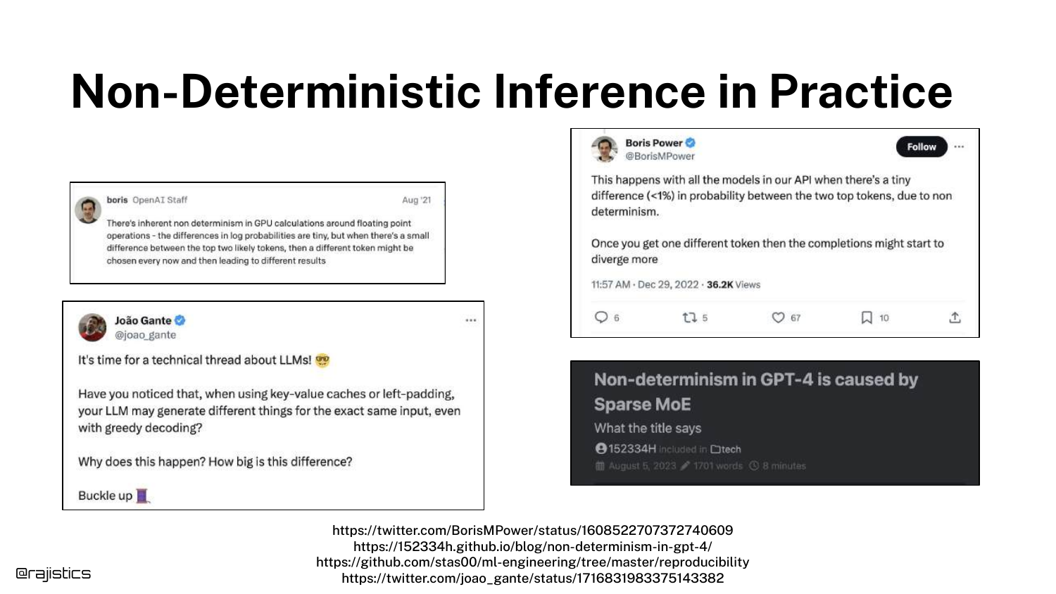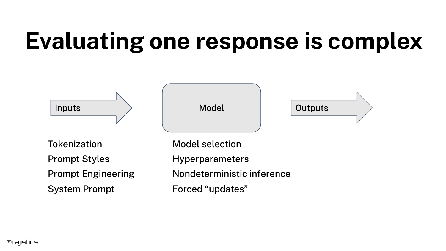 He explains that “chaos” can enter the system at any of these three stages: the input (prompt sensitivity), the model (inference non-determinism), or the output (formatting and evaluation).