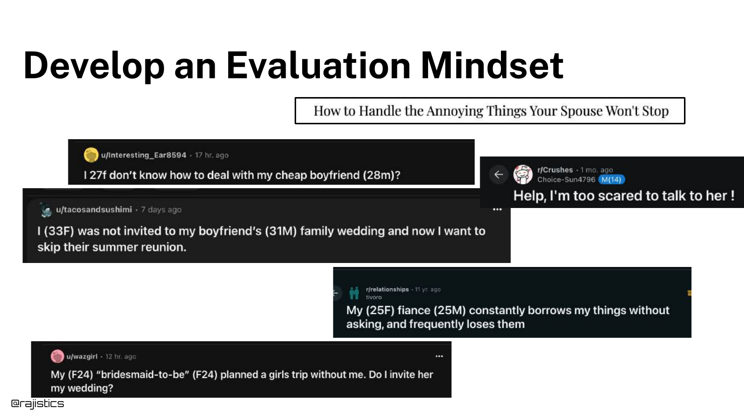 Here is the annotated presentation for Rajiv Shah’s workshop on “Hill Climbing: Best Practices for Evaluating LLMs.”
