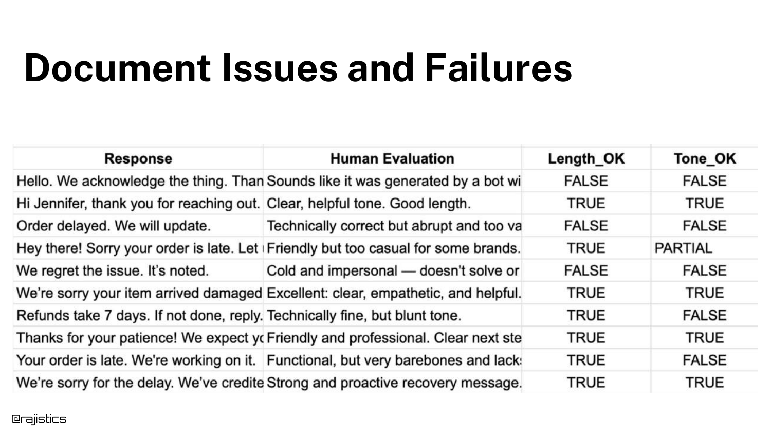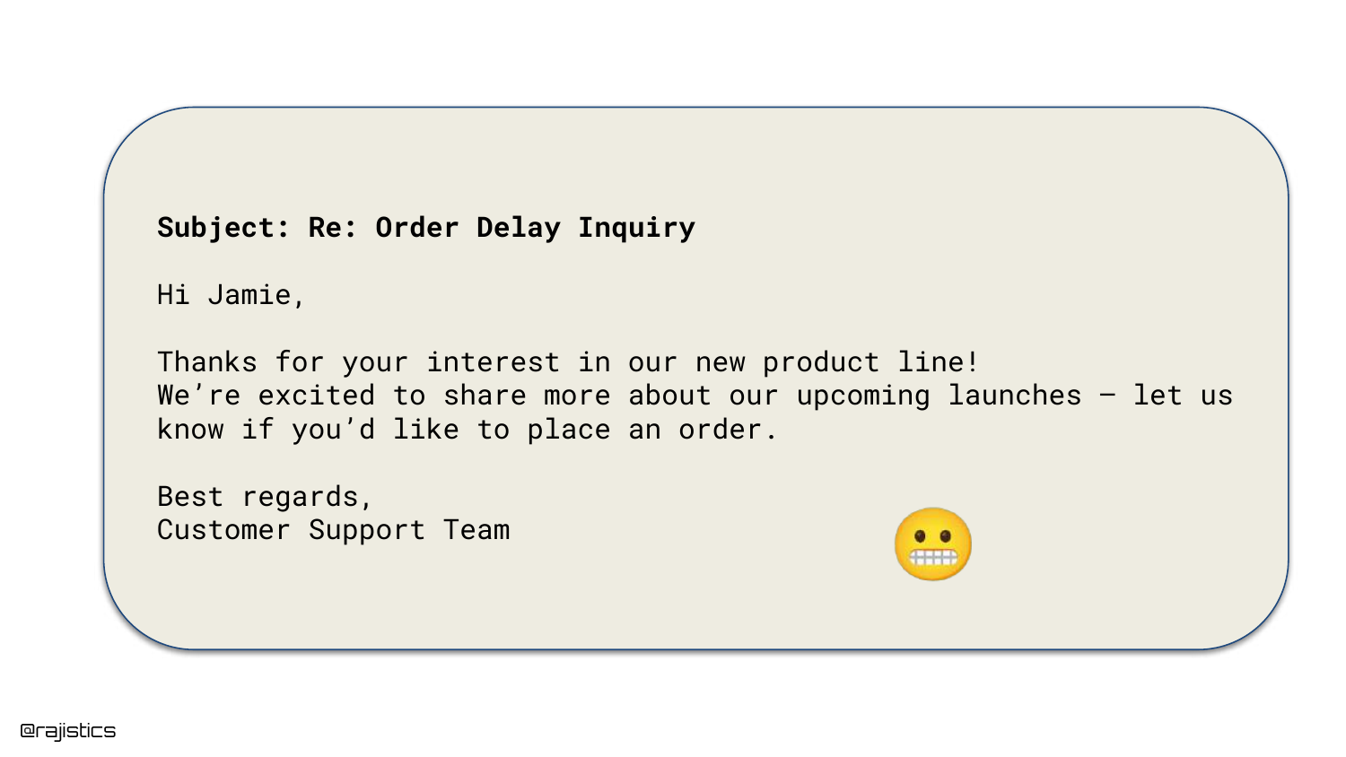 This scenario serves as the baseline example throughout the talk. It represents a high-volume task where automation is desirable, but accuracy and tone are critical for maintaining customer satisfaction and brand reputation.