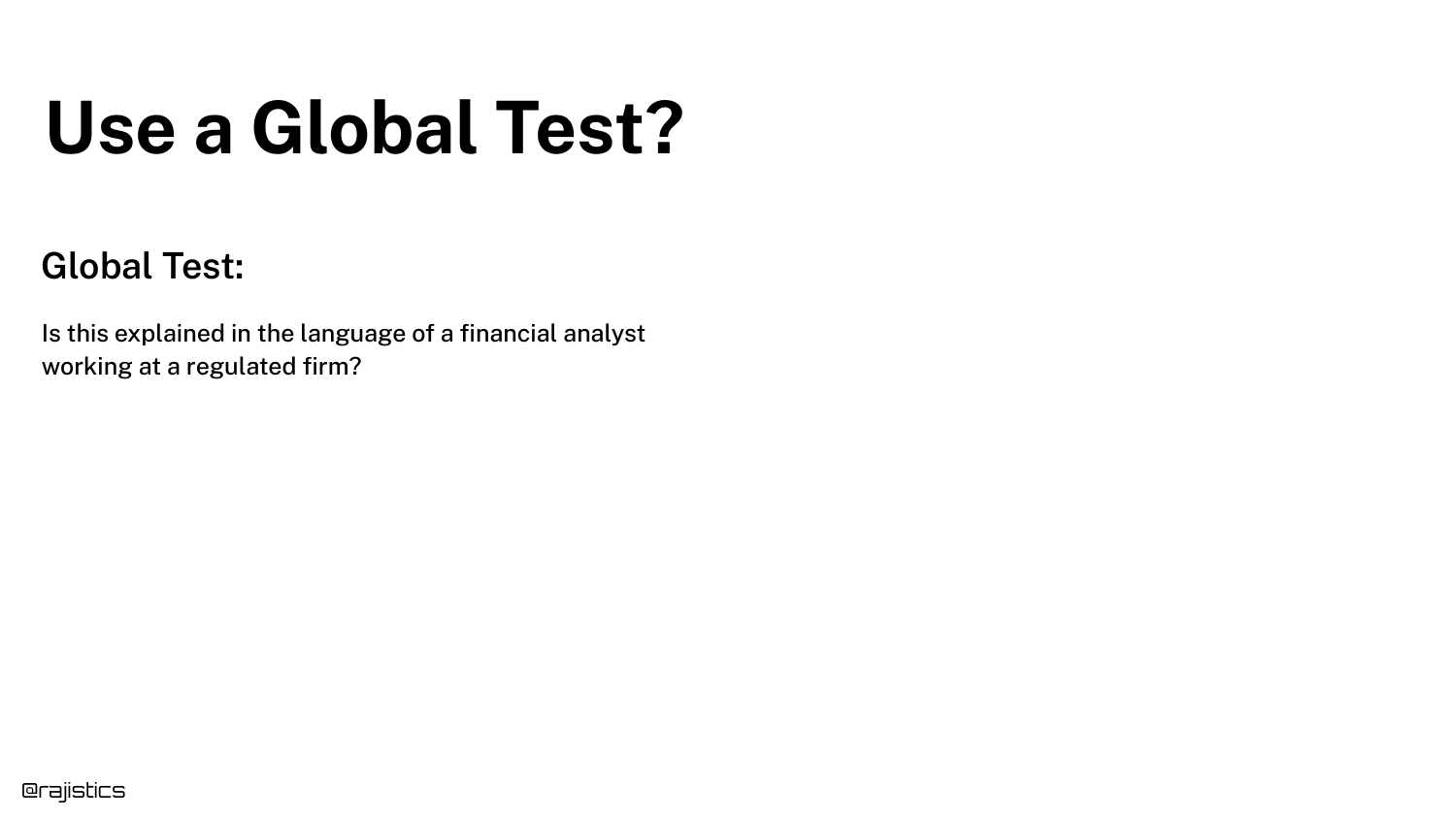 You could use a Global Test: “Was this explained as a financial analyst would?”