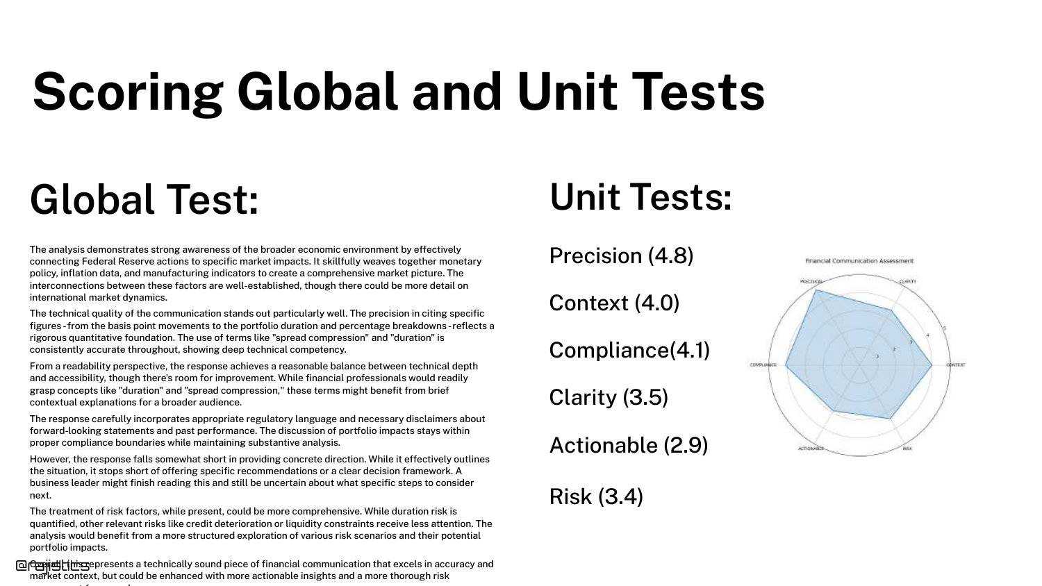This is a complex domain where “good” is highly specific (regulated, precise, risk-aware), making it a perfect candidate for granular unit tests.