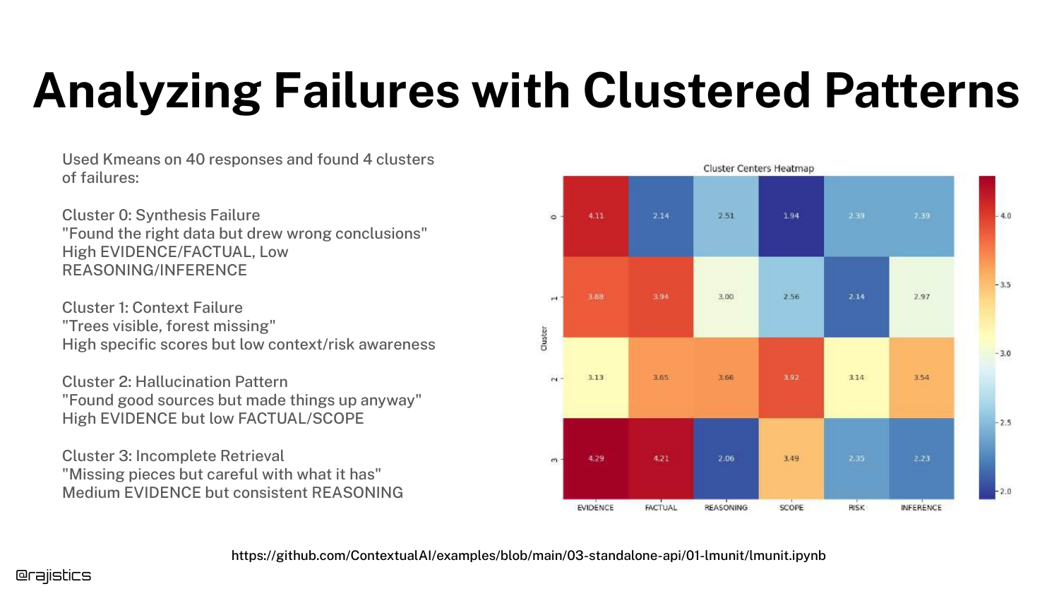 With enough unit test data, you can use Clustering (e.g., K-Means) to group failures. The slide shows clusters like “Synthesis,” “Context,” and “Hallucination.”