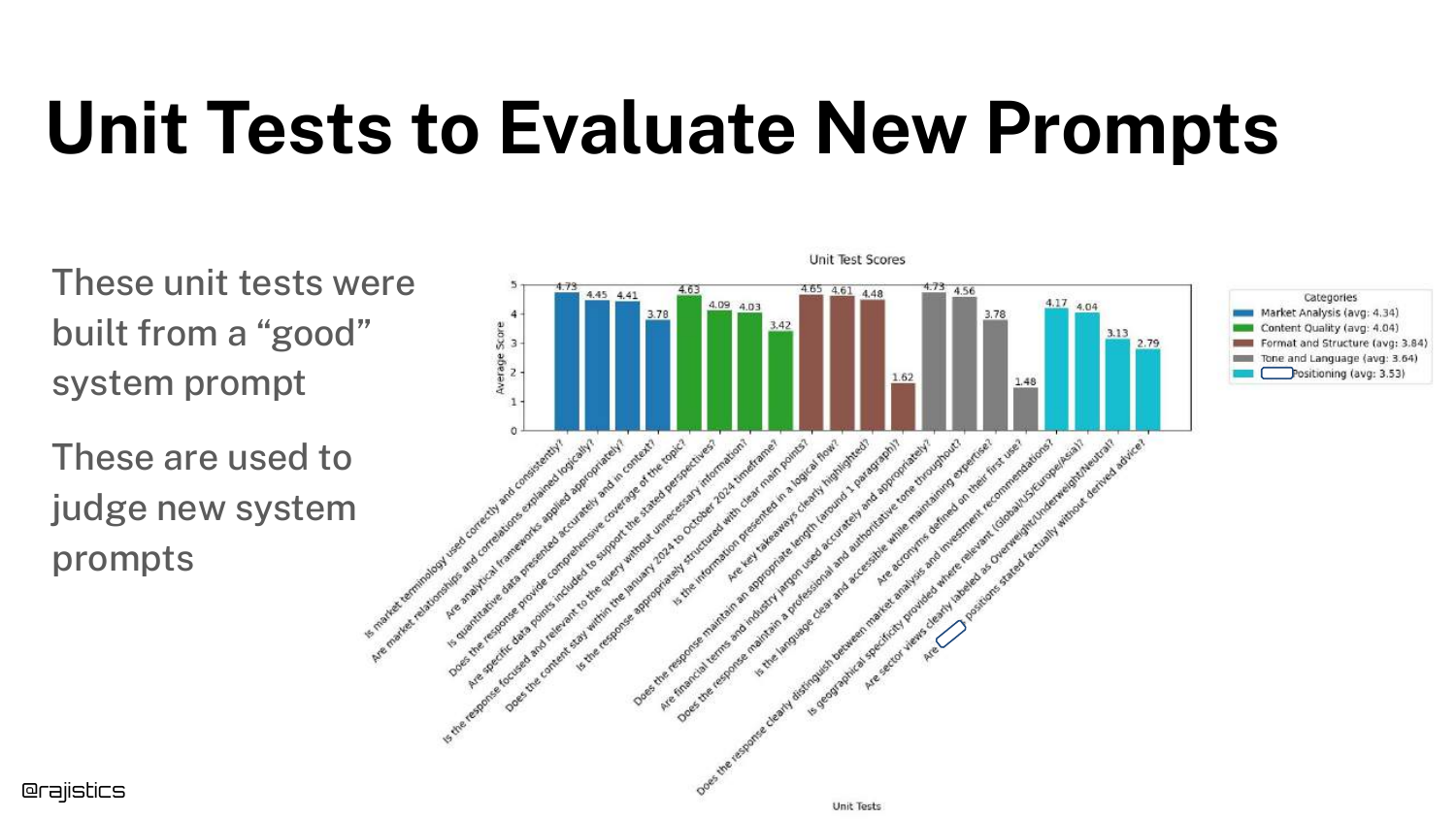 A bar chart shows how unit tests are used to Evaluate New Prompts. By running the full suite of unit tests on a new prompt, you get a “scorecard” of its performance.