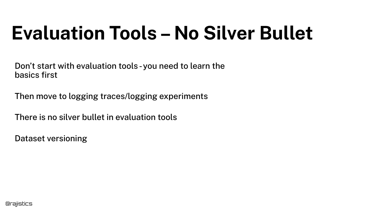 Rajiv reminds the audience that Tools are No Silver Bullet. You must master the basics (datasets, metrics) first.