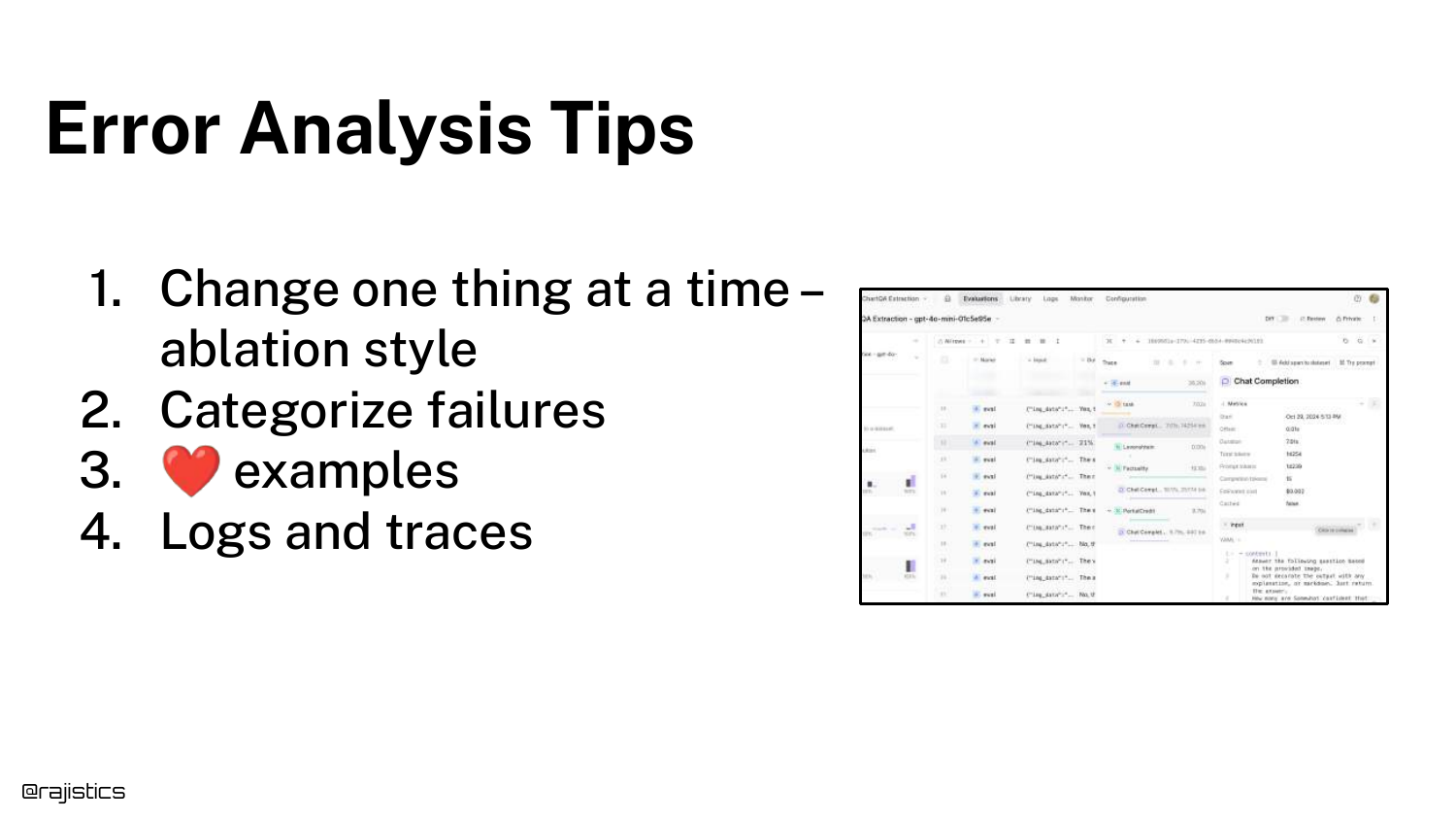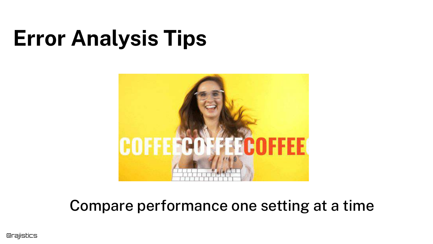 A summary of Error Analysis Tips: Use ablation studies (removing parts to see impact), categorize failures, save interesting examples, and leverage logs/traces.