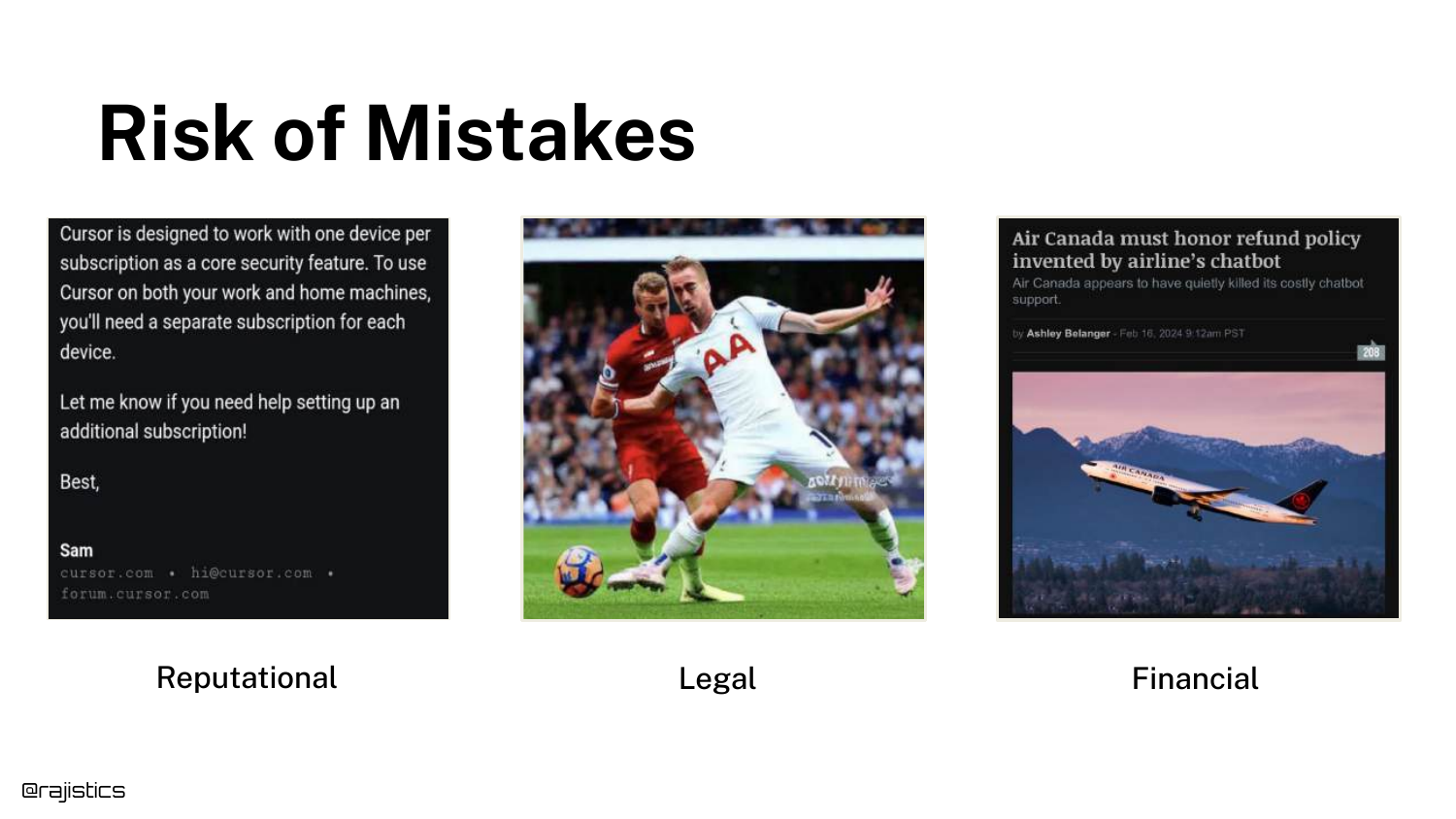 Rajiv categorizes the risks associated with LLM failures into three buckets: Reputational, Legal, and Financial. He cites the example of Cursor, an IDE company, where a support bot hallucinated a policy restricting users to one device, causing customers to cancel subscriptions.