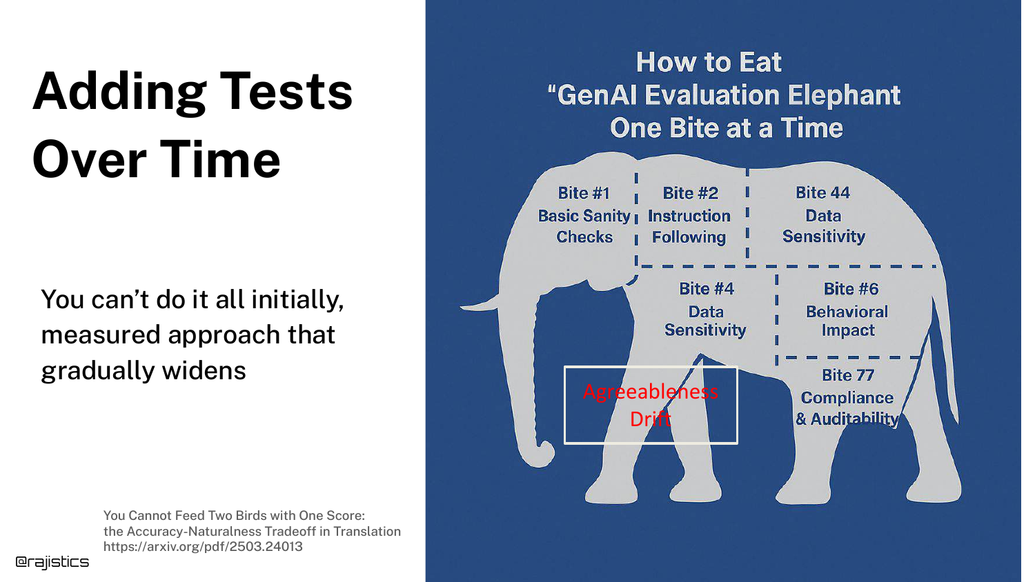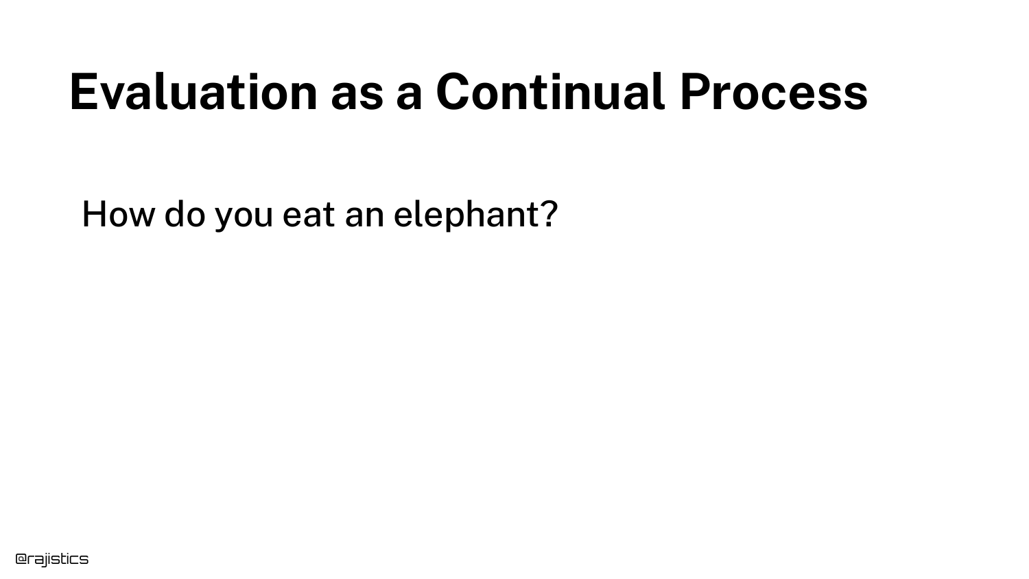 The metaphor “How do you eat an elephant?” addresses the overwhelming nature of building a comprehensive evaluation suite.