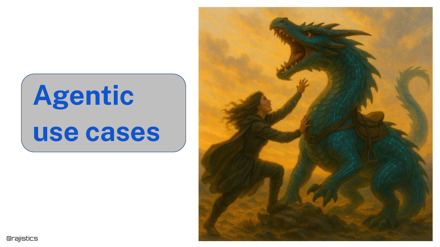 The final section covers Agentic Use Cases, symbolized by a dragon. Agents add a layer of complexity because the model is now making decisions (routing, tool use) rather than just generating text.