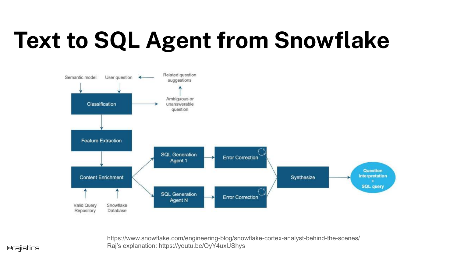 Another example: Text to SQL Agent. This workflow involves classification, feature extraction, and SQL generation.