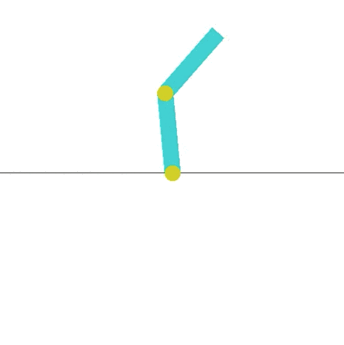 I decided to modify the Acrobot environment. Acrobot is a 2-link pendulum with only the second joint actuated (it has three states, left, right, and no movement). The goal is to swing the end to a height of at least one link above the base. If you look at the leaderboard on OpenAIs site, they meet that criterion, but its not very impressive. Here is the current highest scoring entry: