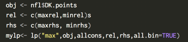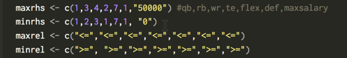 The goal here is to build the best possible team for a salary cap, let’s say $50,000. A team consists of a quarterback, running backs, wide receivers, tight ends, and a defense. We can use the lpSolve package in R to set up the problem. Here is a code snippet for setting up the constraints.