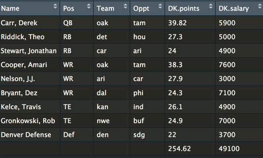The code shows that we have set up the problem to maximize the objective of the most points and include our constraints. Once the code is run, it outputs an optimal team! I forked an existing repo and have made the R code and dataset are available here. A more sophisticated python optimization repo is also available.