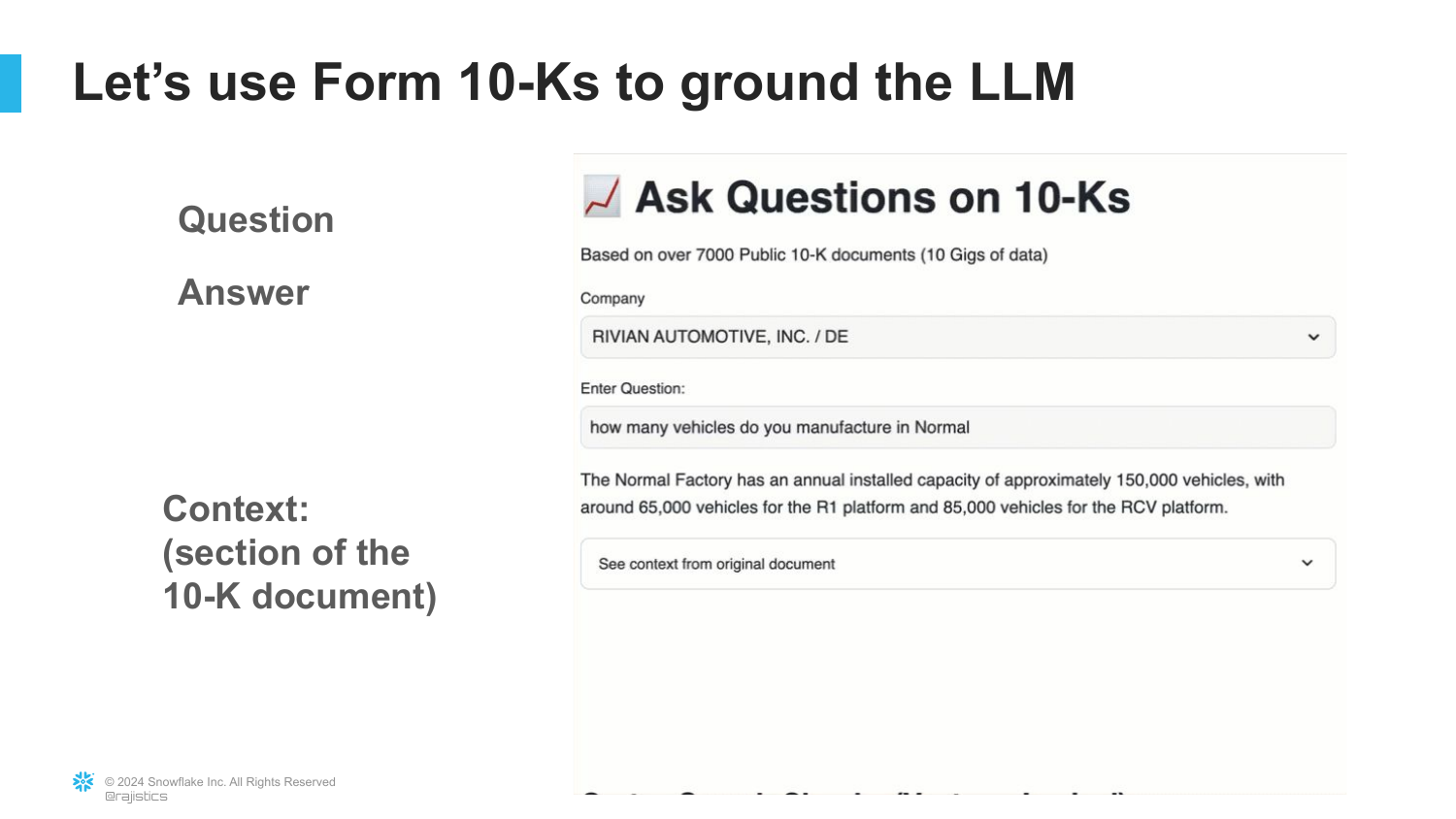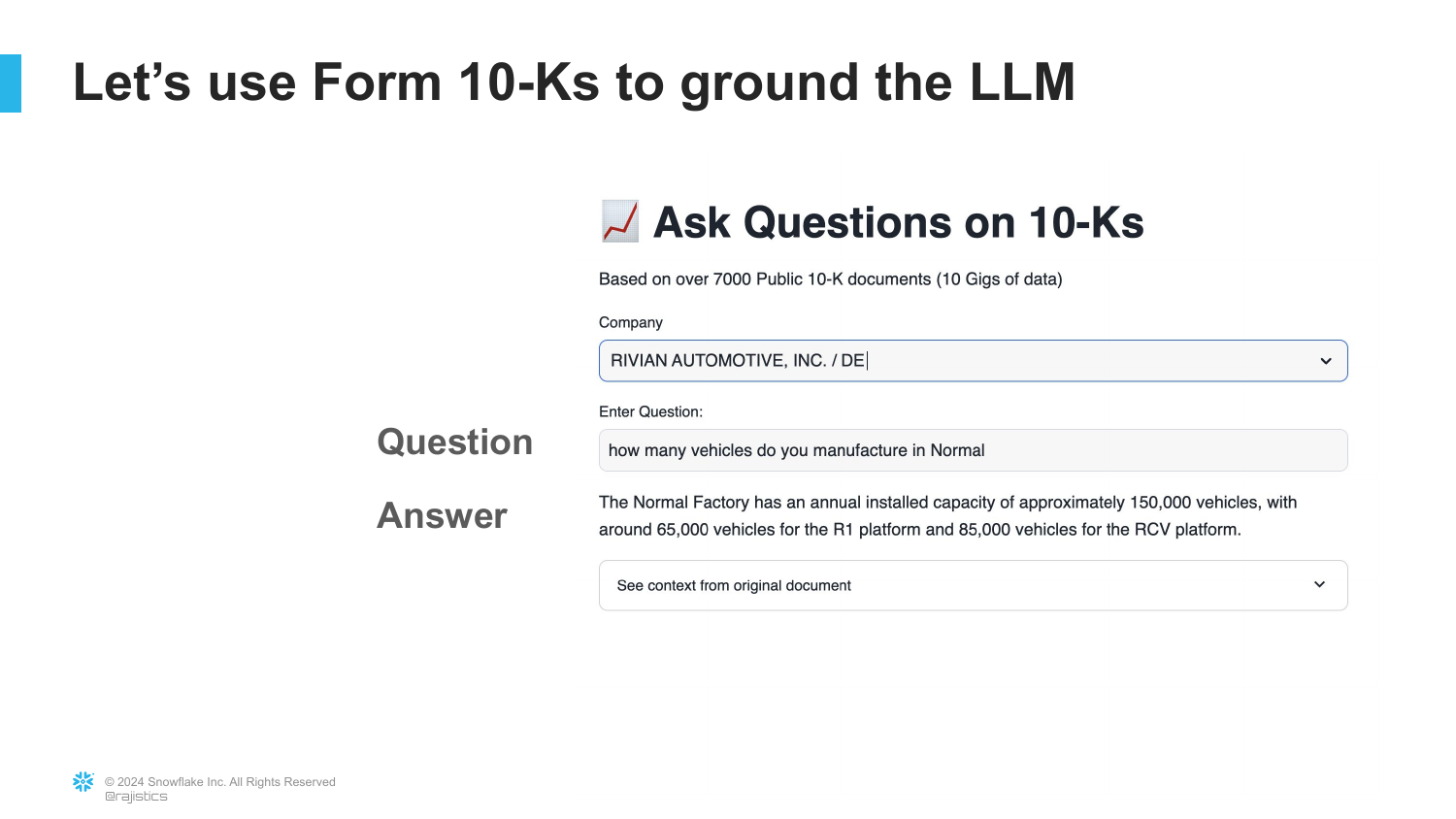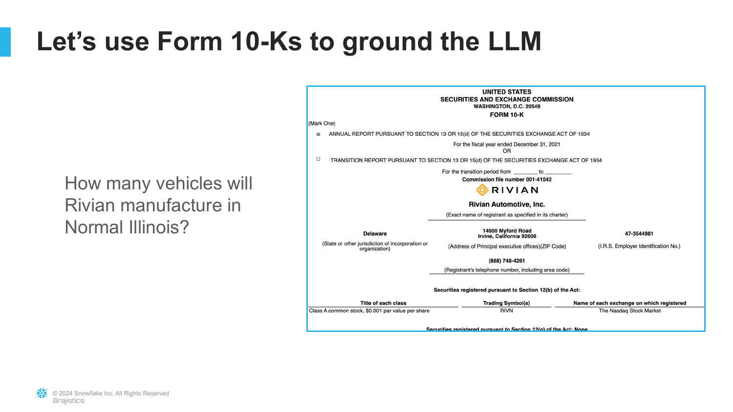 This slide prepares the audience to see how the previous question about Rivian’s manufacturing capacity—which generated inconsistent answers earlier—can be answered accurately when the model is forced to look at Rivian’s official financial filings.