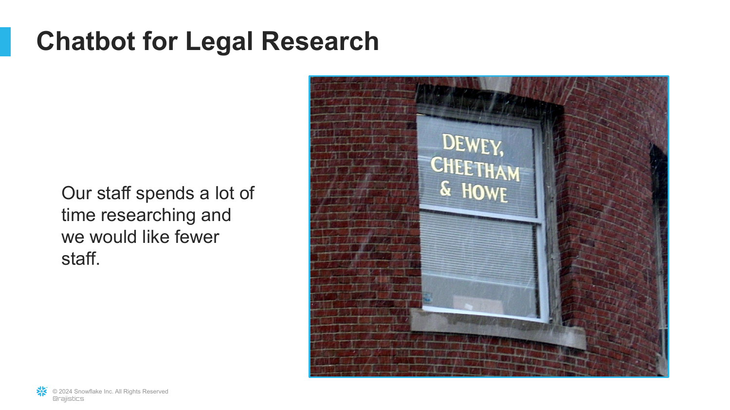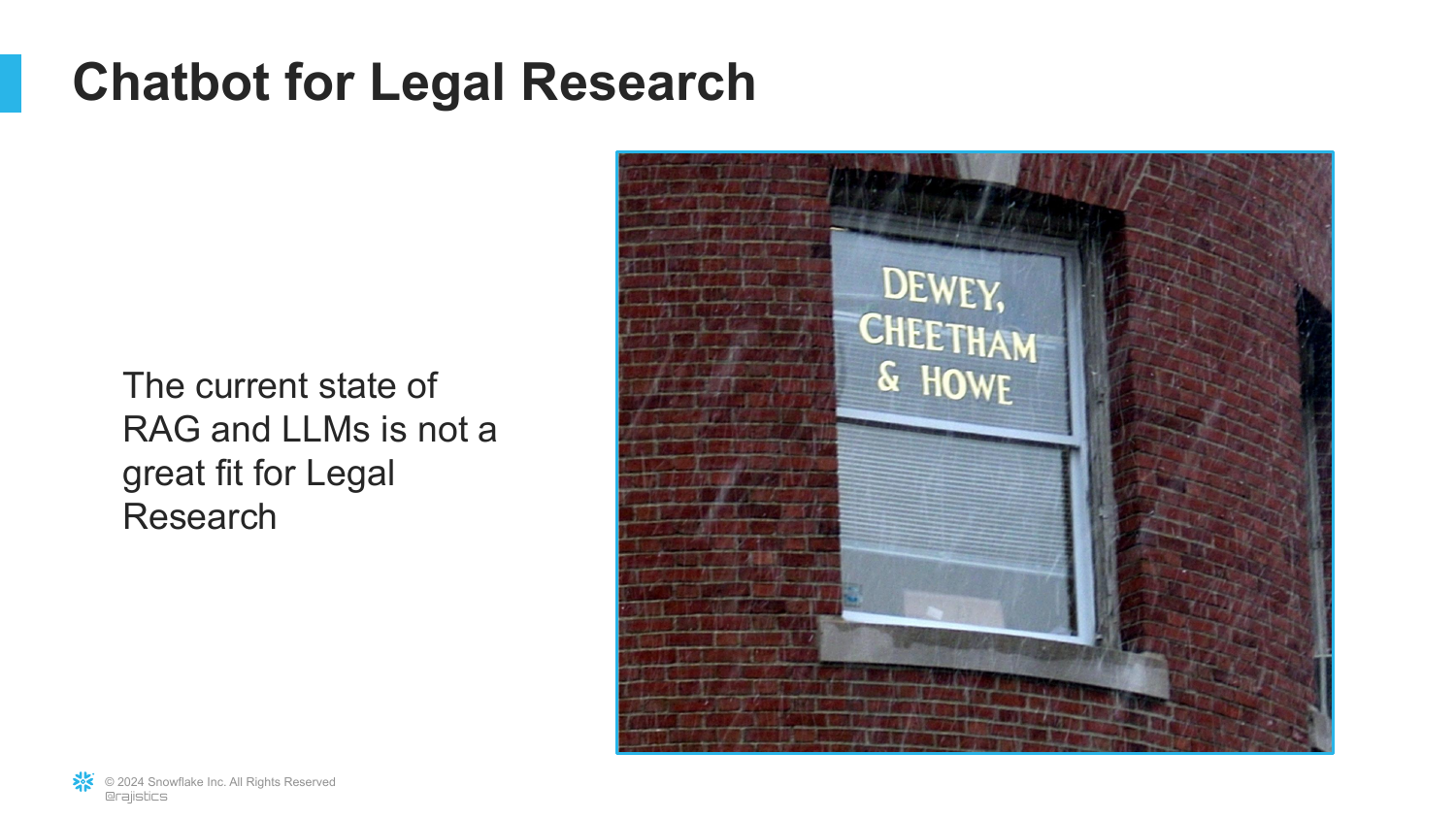 The narrative shifts to the fictional law firm “Dewey, Cheatham, and Howe.” The firm wants to use AI to reduce the heavy workload of legal research. The initial thought process is to use raw LLMs because they are knowledgeable.