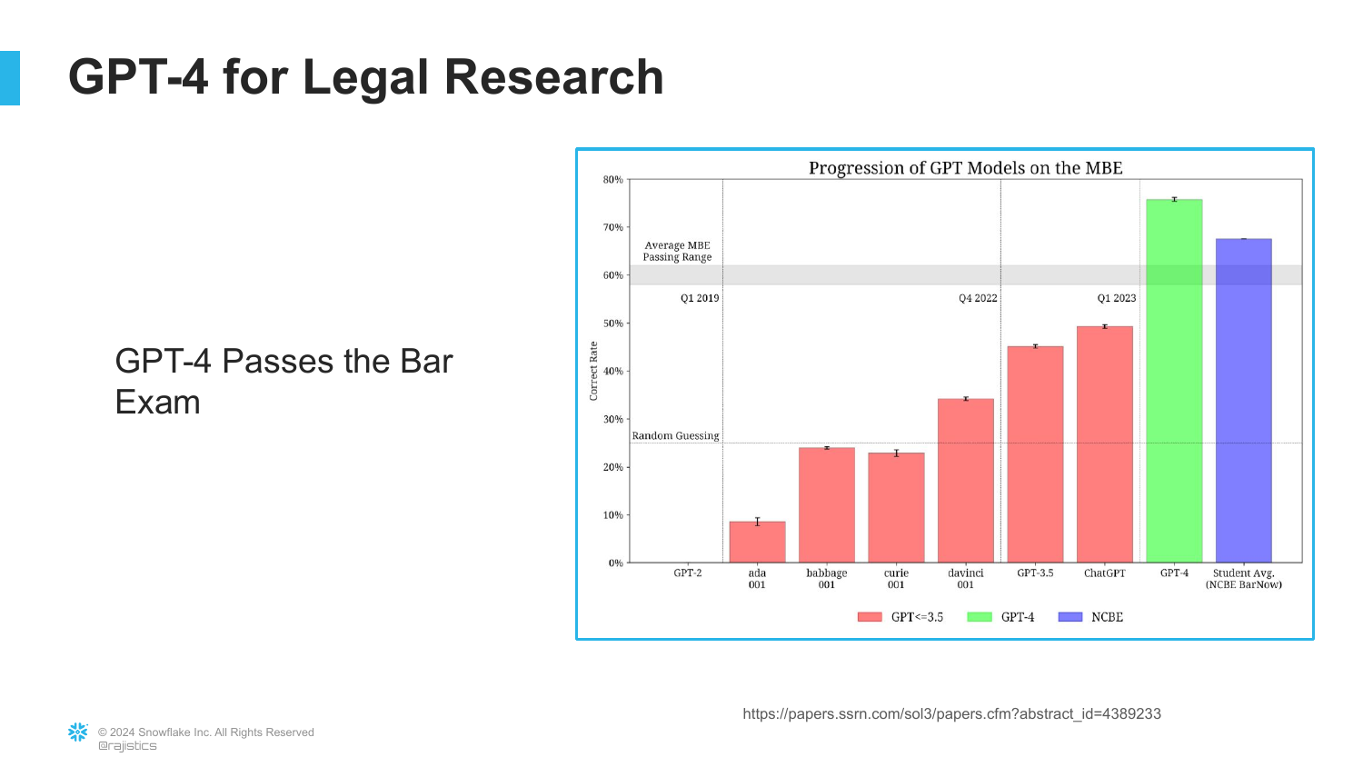 This chart reinforces the previous assumption, showing the progression of GPT models on the Multistate Bar Exam (MBE). GPT-4 significantly outperforms its predecessors, achieving a passing score.