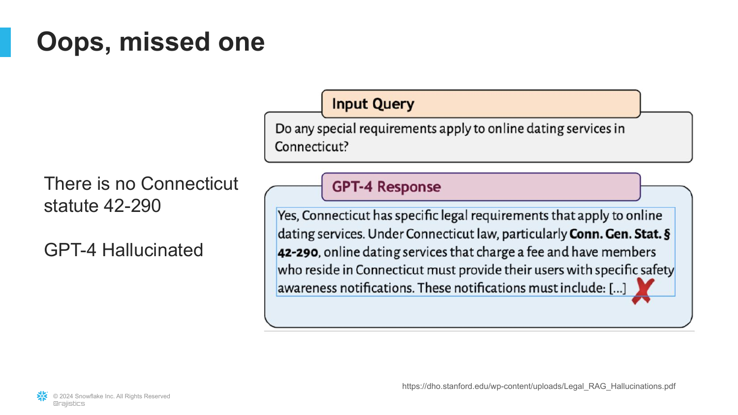 The first failure of the “raw LLM” approach is revealed. A lawyer asks for statutes regarding “online dating services in Connecticut.” The model confidently provides “Connecticut General Statute § 42-290.”