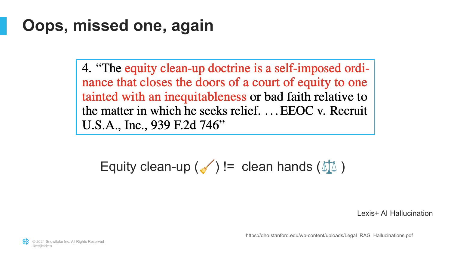 Even with RAG and real citations, a new problem emerges: Conceptual confusion. The AI provides a real case but confuses the “Equity Cleanup Doctrine” with the “Doctrine of Clean Hands.” The speaker explains that while the words are similar, the legal concepts are distinct (one is about consolidating claims, the other about a plaintiff’s conduct, illustrated by a joke about P. Diddy).