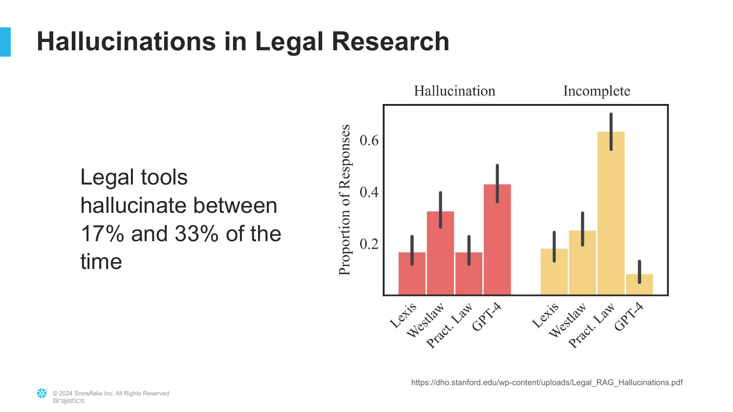 The speaker references a Stanford paper analyzing hallucination rates across major legal AI tools (Lexis, Westlaw, GPT-4). The chart shows that these tools still hallucinate or provide incomplete answers 17% to 33% of the time.