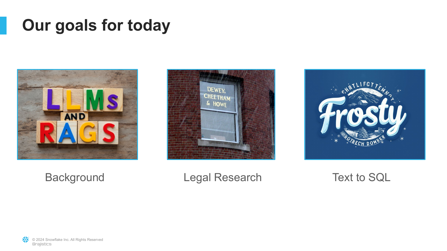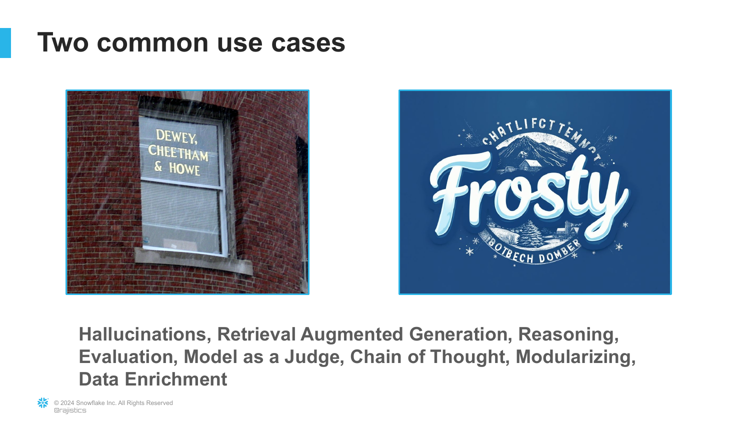 The agenda for the talk is outlined here. The speaker intends to cover the foundational mechanisms of how to use LLMs effectively, specifically focusing on RAG. To make the concepts relatable, the presentation uses two storytelling devices: a fictional law firm (“Dewey, Cheatham, and Howe”) and a hypothetical company (“Frosty”).