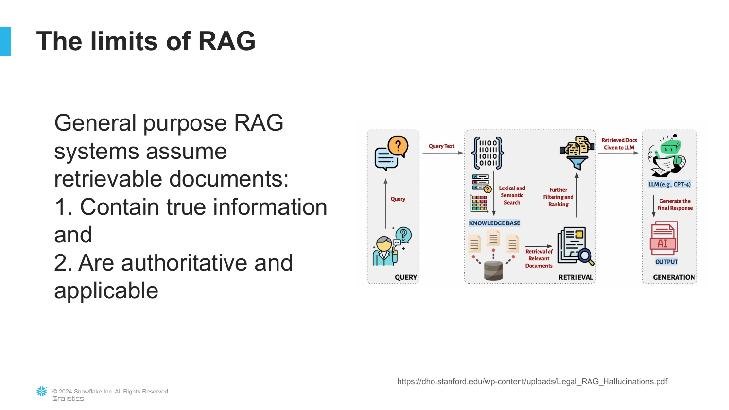 This slide summarizes the limitations discovered in the legal example. RAG works well when documents are “True, Authoritative, and Applicable.” However, in complex domains like law, these attributes are often contested.
