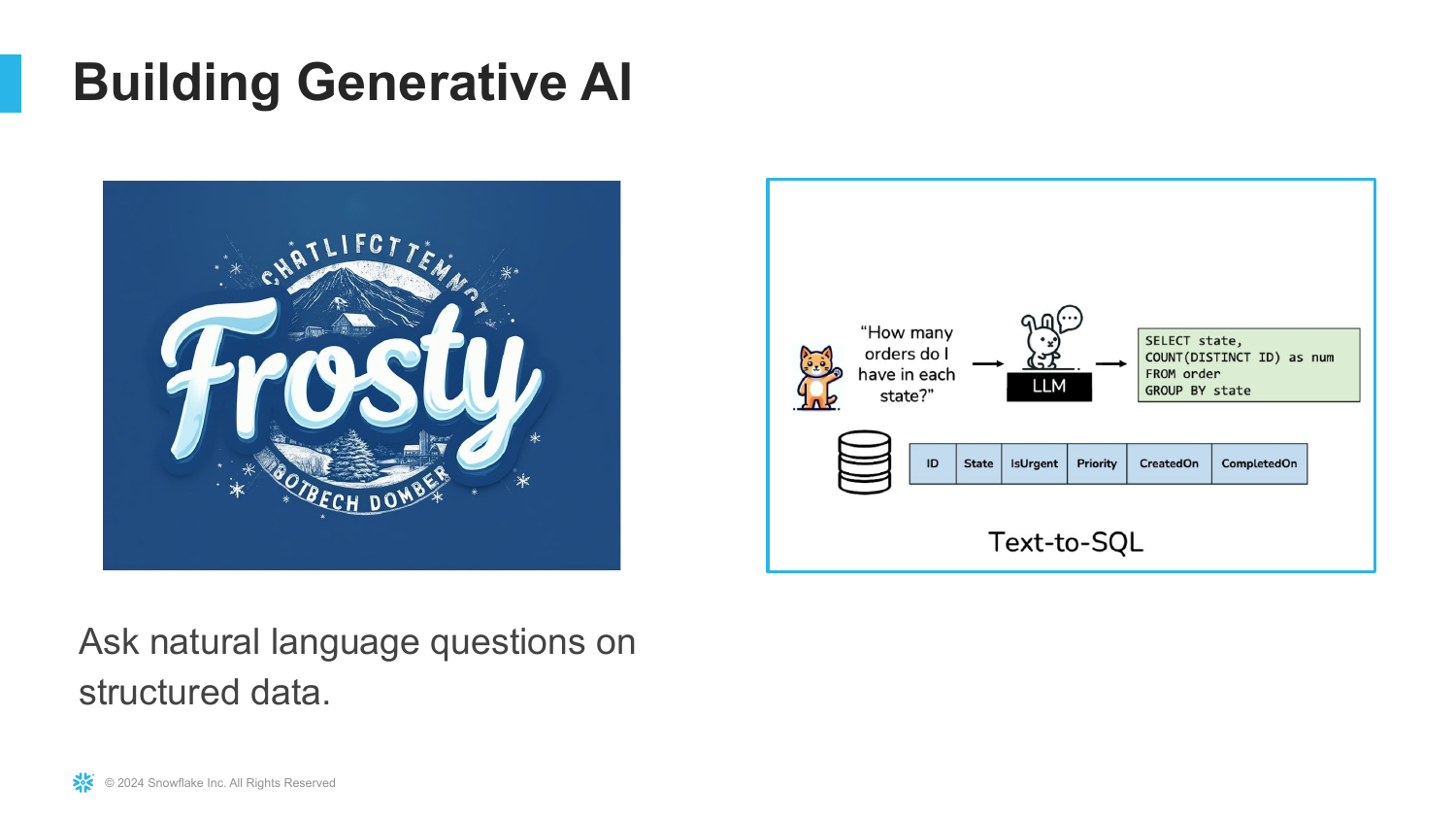 The presentation shifts to the story of “Frosty,” a company building a Text-to-SQL application. The goal is to turn natural language questions (e.g., “How many orders do I have in each state?”) into SQL code that can query a database.