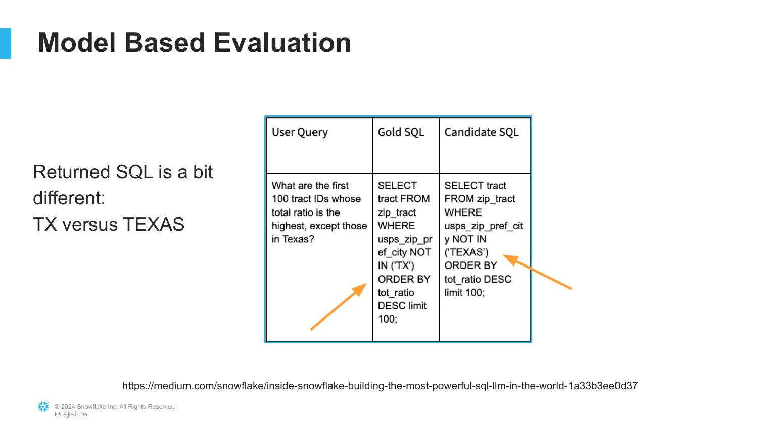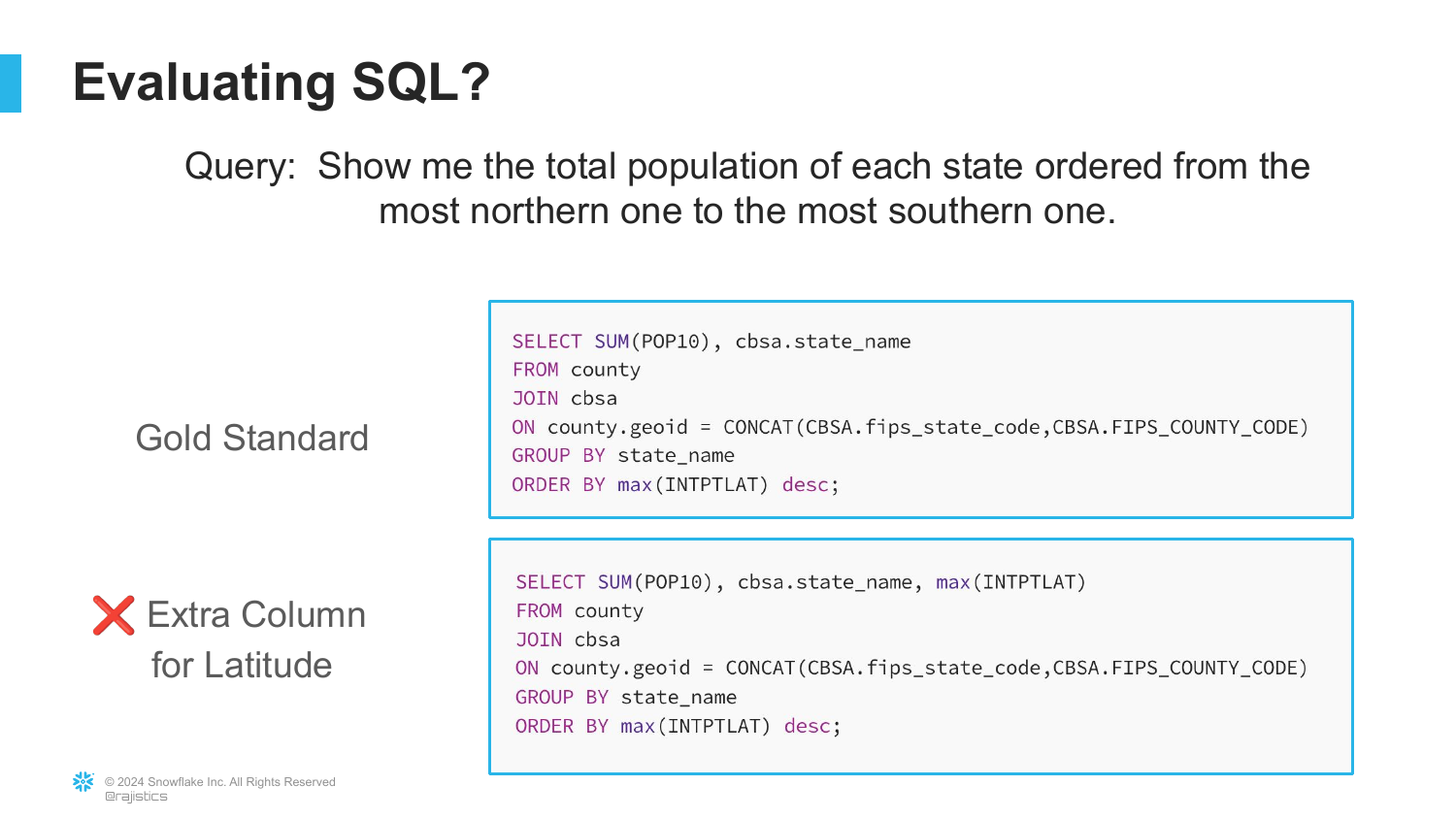 In this example, the AI added an extra column (“latitude”) that wasn’t requested. While the query might still work, it isn’t an exact match. The speaker notes, “We really need to have a way to give partial credit,” because simple string matching would mark this helpful addition as a failure.