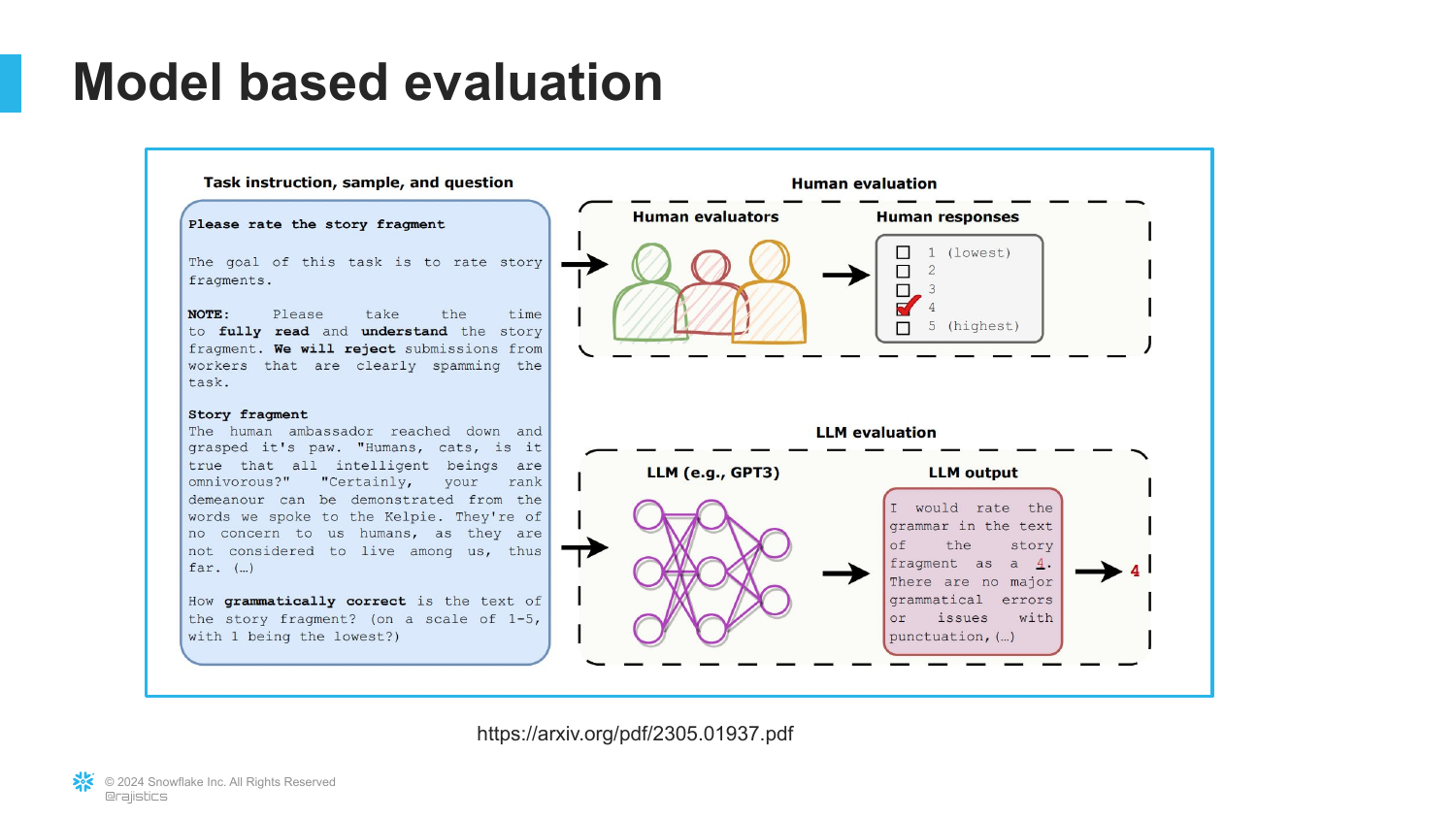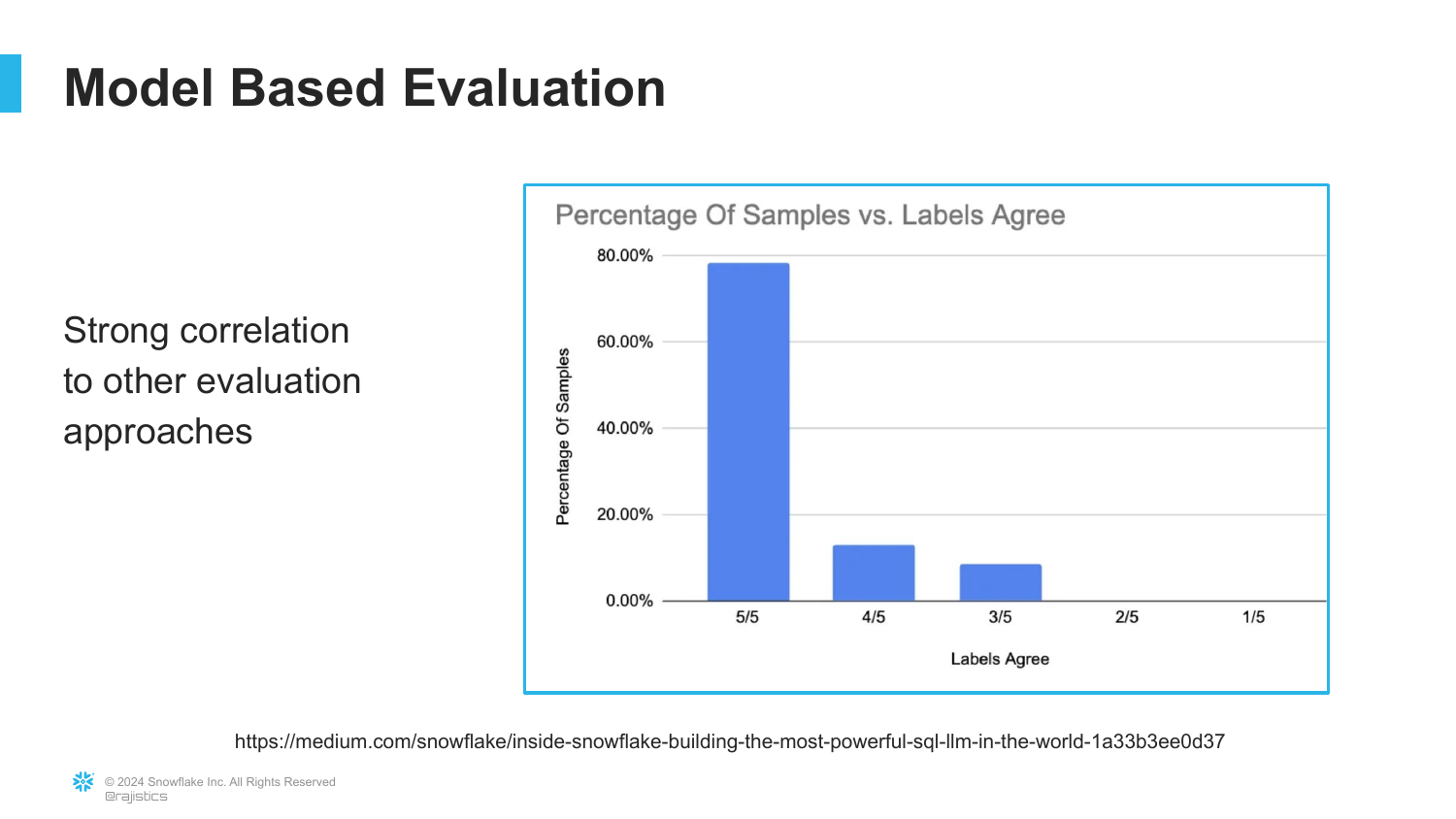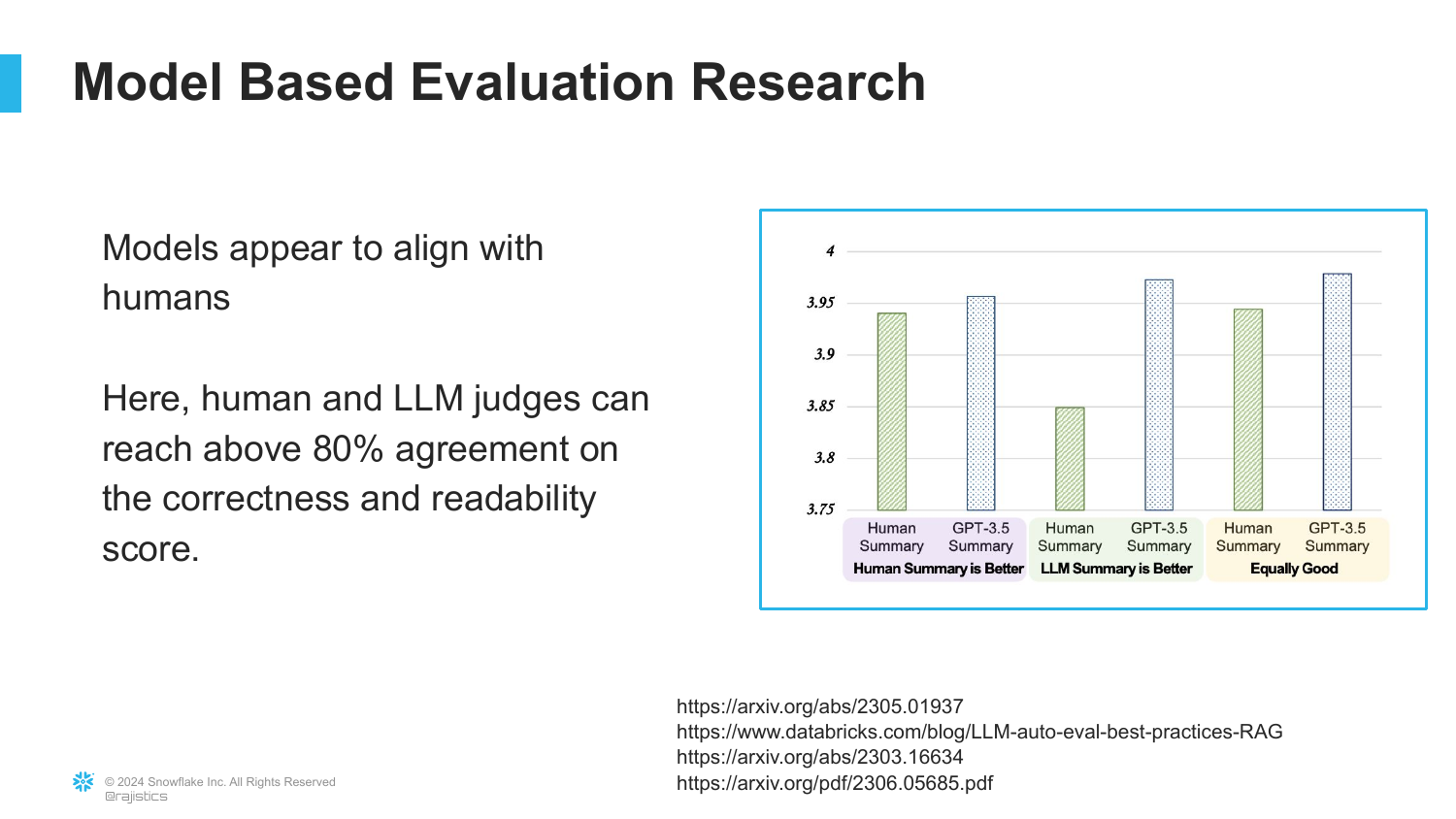 “I got tired of adding research sites here… universally we see that often in many contexts that these large language models correlate about 80% of the time to humans.” This establishes model-based evaluation as an industry standard.