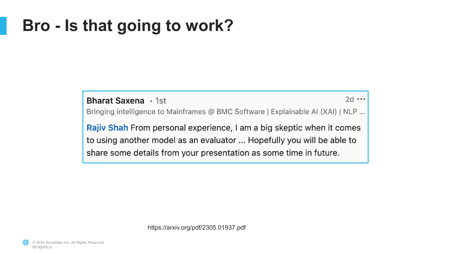 The speaker acknowledges the common reaction to this technique: “Is that going to work? I mean that’s like the fox guarding the outhouse.” There is a fear of “model collapse” or circular logic when AI evaluates AI.