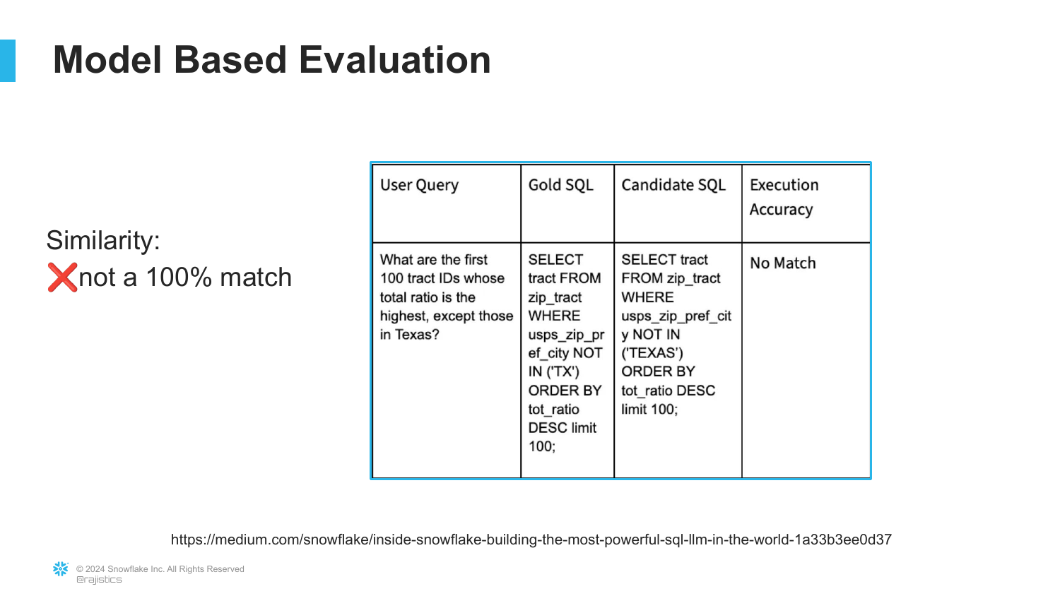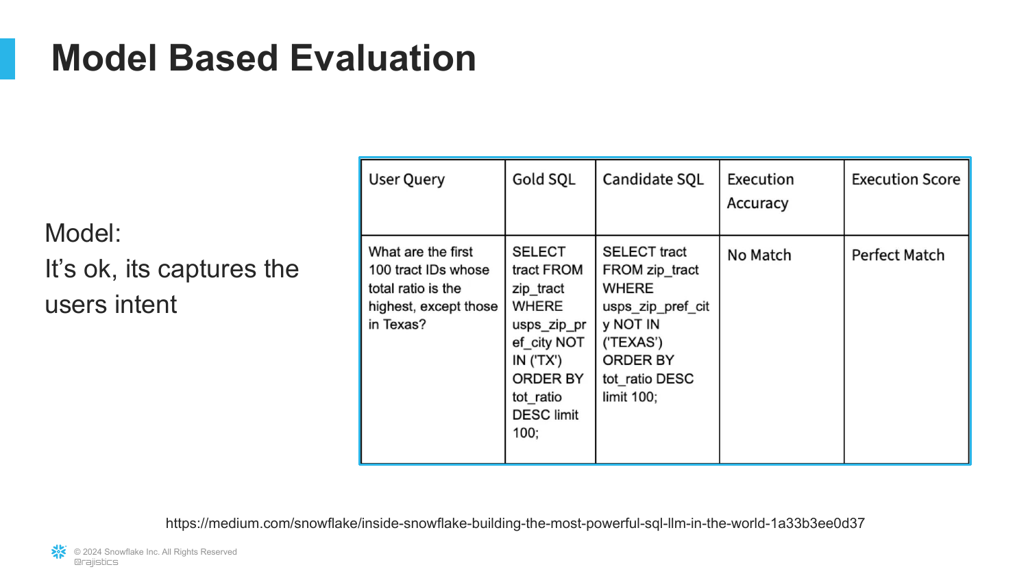 This slide confirms that under “Execution Accuracy” (strict matching), the query is a failure (“No Match”). This metric is too harsh for development because it obscures progress; a model that gets the logic right but misses an abbreviation is much better than one that writes gibberish.