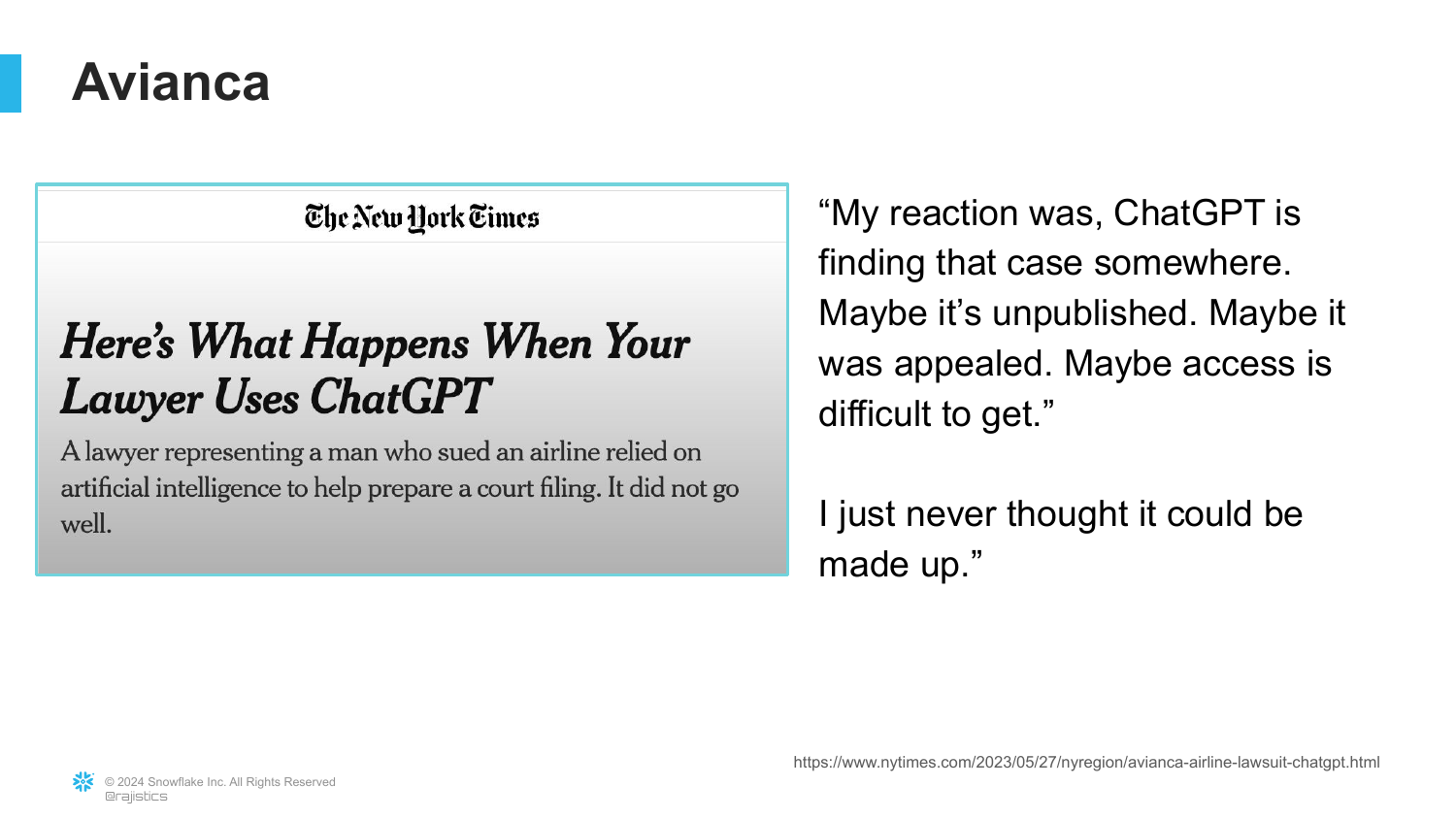 The speaker introduces the concept of hallucinations through a famous real-world example involving the airline Avianca. A lawyer, attempting to speed up his work on a brief regarding a personal injury case, used ChatGPT for legal research. The AI “found some cases that were unpublished,” which the lawyer cited in court.