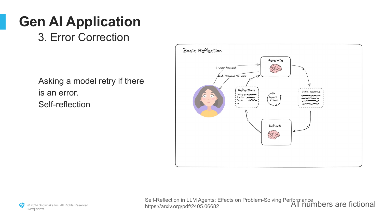 The next optimization is Error Correction via self-reflection. When the model generates an error, the system asks the model to “reflect upon it” or think “step-by-step.”