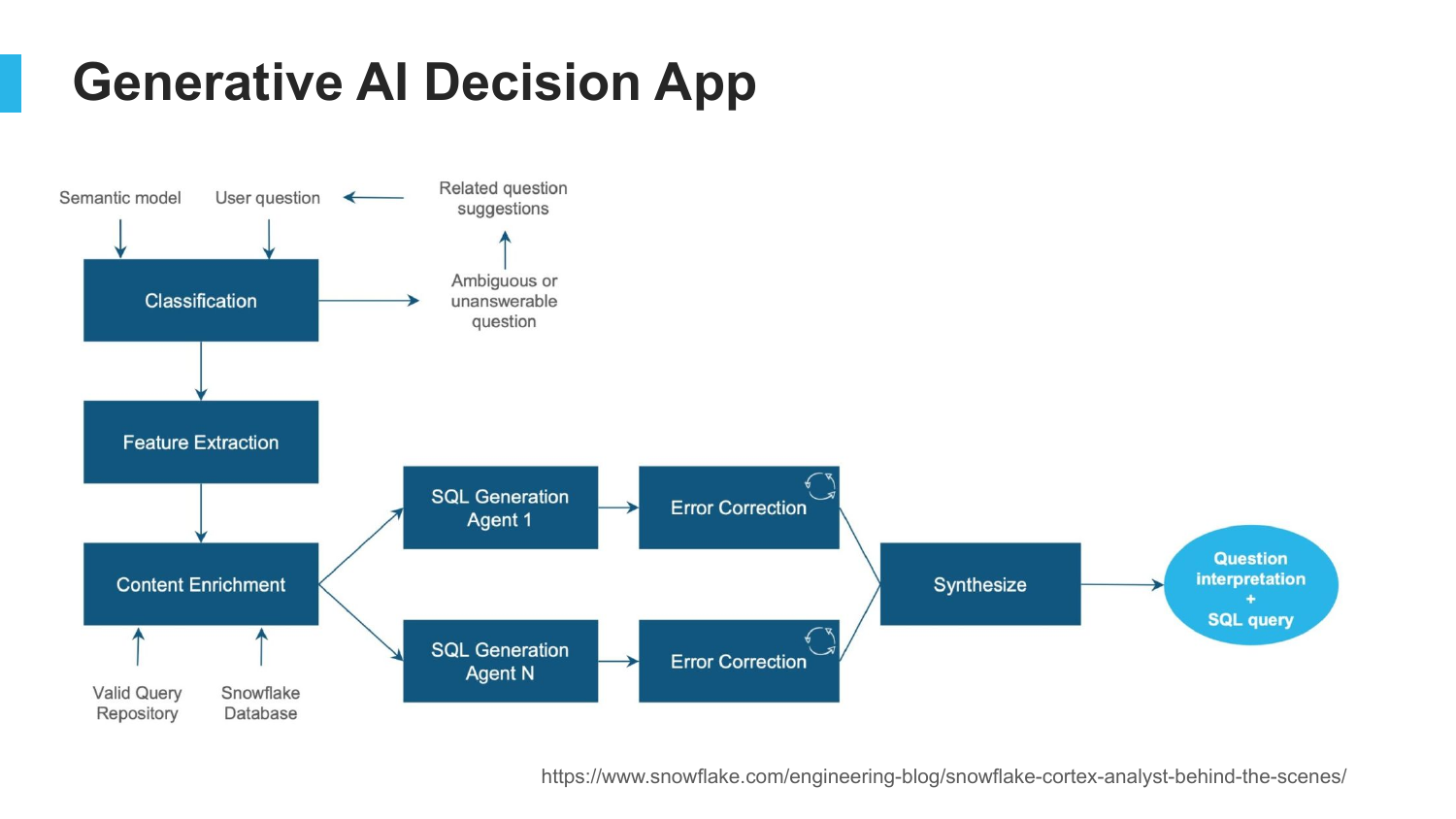 This flowchart represents the final, production-grade system. It is no longer just a prompt sent to a model. It includes classification, feature extraction, multiple SQL generation agents, error correction, and a semantic layer.