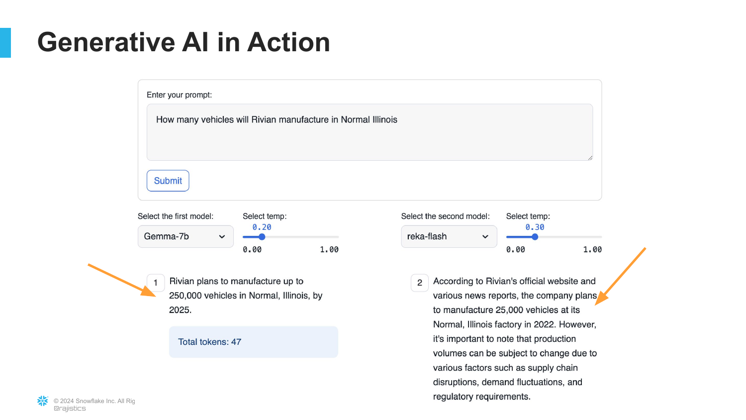 To demonstrate the variability of LLMs, the speaker presents a side-by-side comparison of two models (Google Gemma and a “Woflesh” model) answering the same prompt: “How many vehicles will Rivian manufacture in Normal, Illinois?” The models provide different answers.