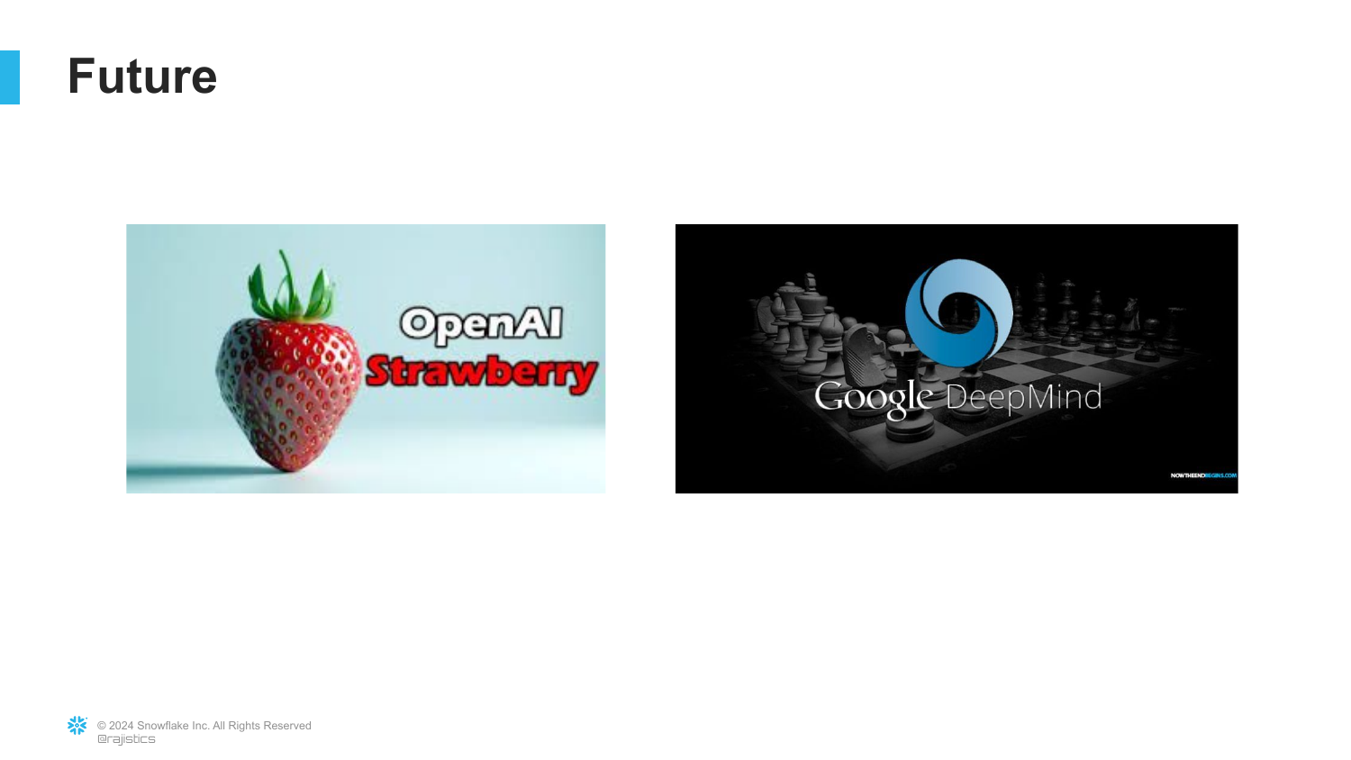 The speaker pivots to the future, acknowledging the rapid pace of innovation from companies like OpenAI and Google DeepMind. He addresses the audience’s potential skepticism: “The future is you’re just going to be able to just take all your data cram it into one thing it’s just going to solve it all for you.”