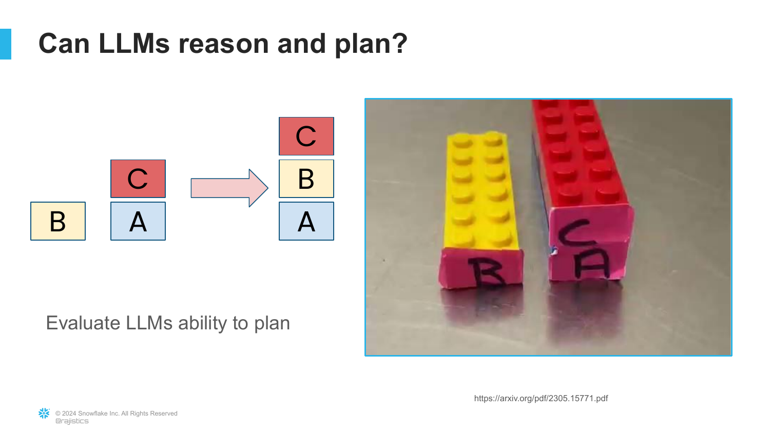 To test reasoning, the speaker introduces the Block World benchmark. The task is to stack colored blocks in a specific order. This requires multi-step planning.