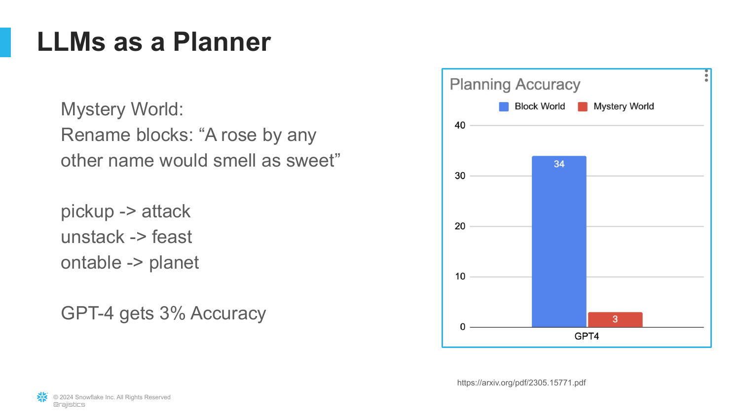 The results for GPT-4 are shown. While it achieves 34% on the standard Block World, its performance collapses to 3% in “Mystery World.” Mystery World is the same problem, but the block names are randomized (e.g., obfuscated).