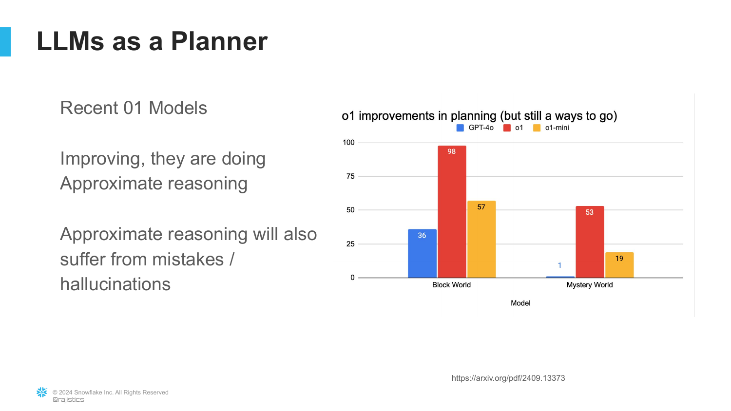 The speaker updates the data with the very latest OpenAI o1 model results. This model uses “Chain of Thought on steroids” (reinforcement learning). It shows a massive improvement, jumping to nearly 100% on Block World and significantly higher on Mystery World (around 37-53%).