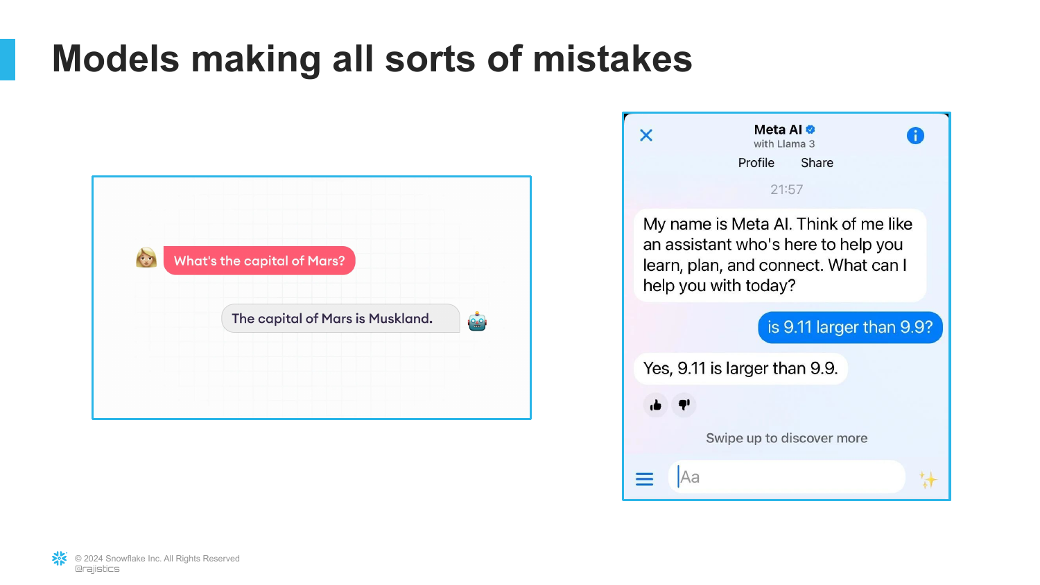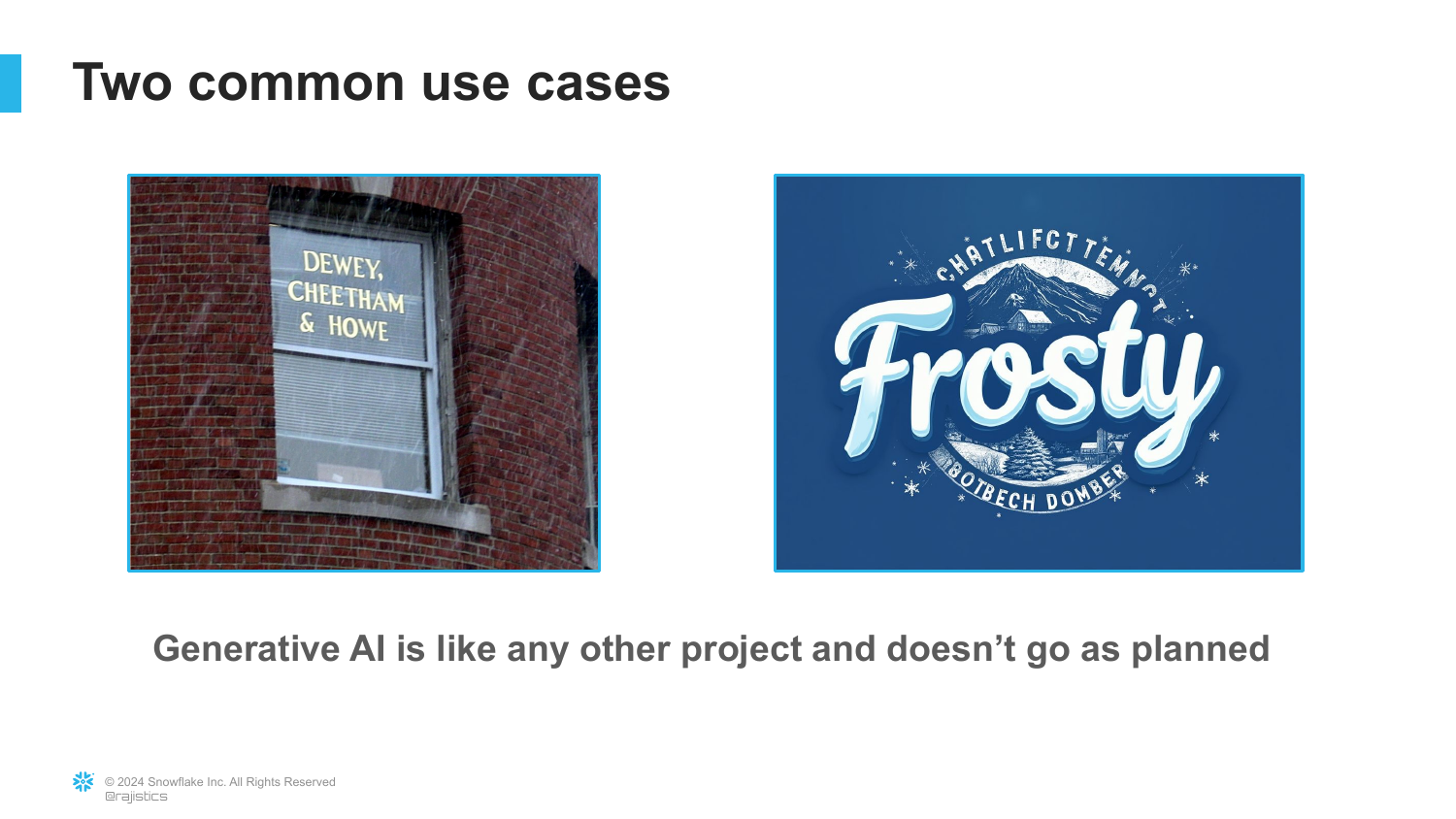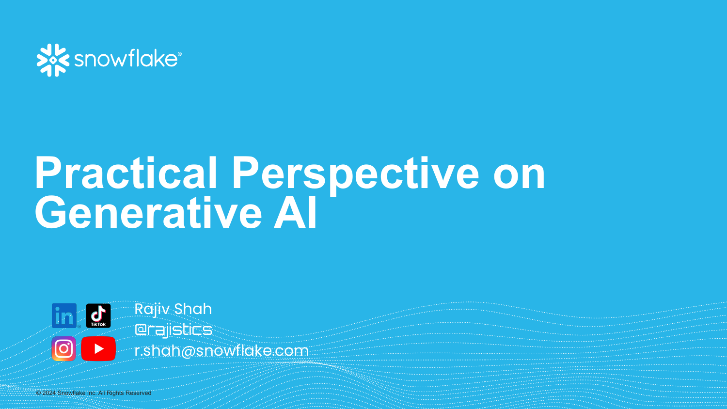 This presentation begins with an introduction by Rajiv Shah from Snowflake. The talk focuses on distinguishing “what’s easy to do with LLMs, what’s hard to do with LLMs, and where that boundary is for generative AI.” The content is framed as a practical guide for enterprises navigating the hype versus the reality of implementing these technologies.