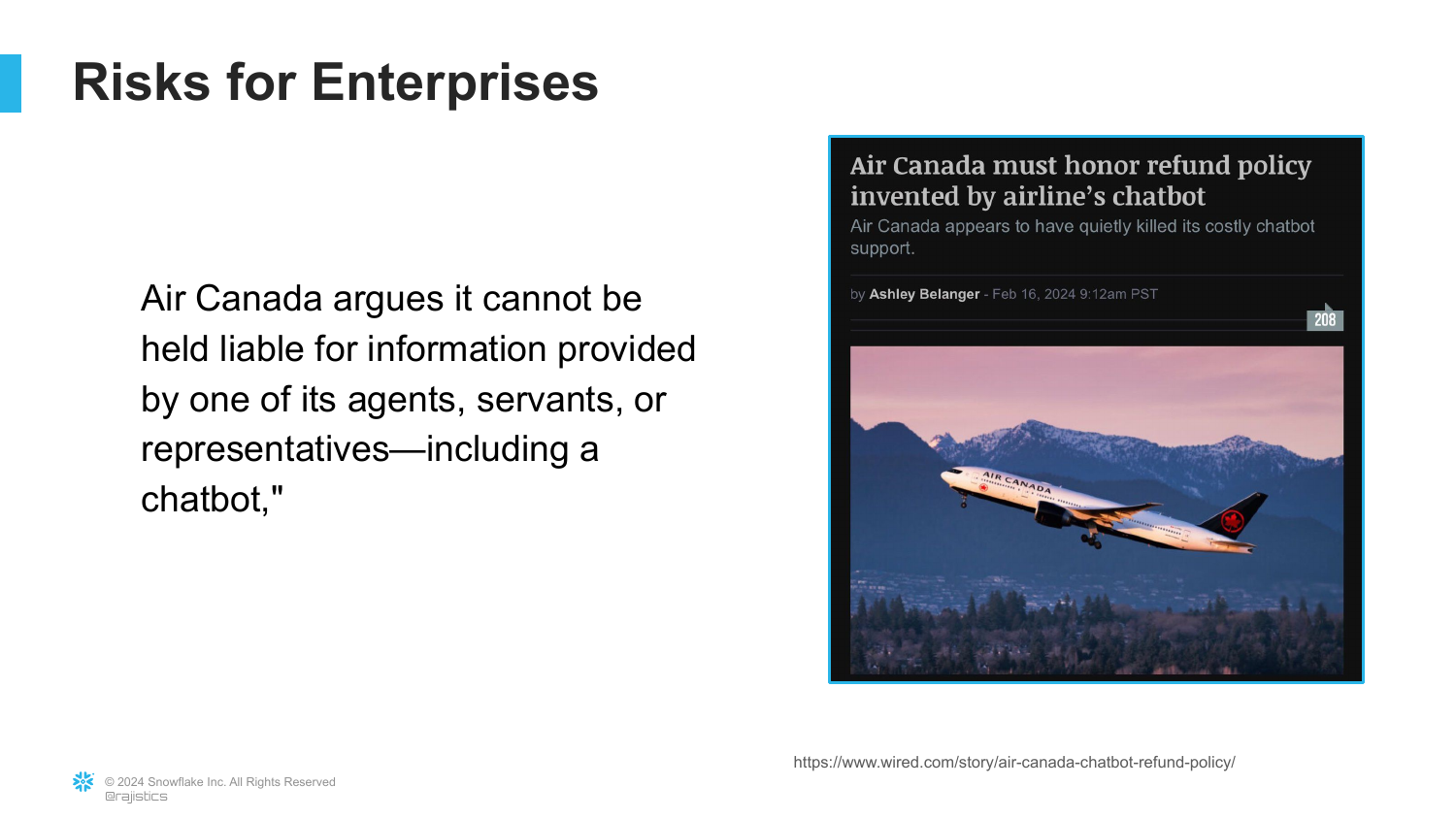 This slide highlights the liability risks for companies, citing the Air Canada chatbot case. In this instance, a chatbot invented a refund policy that did not exist. When the customer sued, the airline argued the chatbot was responsible, but the tribunal ruled the company was liable for its agent’s statements.