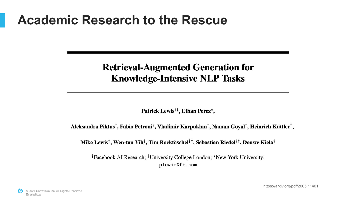 To solve the hallucination problem, the presentation introduces Retrieval-Augmented Generation (RAG). The speaker describes this as a solution from academia designed to “ground” the model. Instead of relying solely on the model’s internal training data, RAG surrounds the model with external context.