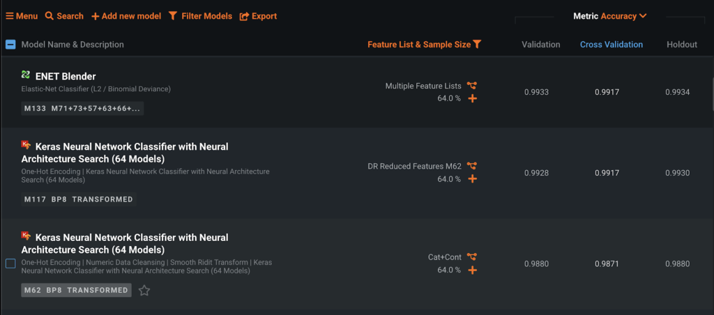 Automated feature selection in DataRobot provides a more parsimonious featurelist. In the Poker Hand dataset, DataRobot created a DR Reduced Features list with only six features. The starting feature list for this dataset, Cat+Cont, contained 15 features. The leaderboard below shows that the simpler DR Reduced Features list performs better than the full Cat+Cont feature list. The model below was optimized on log loss, but I am viewing the accuracy metrics for comparison to the existing benchmarks.