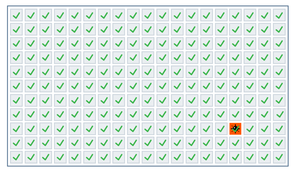 To understand why accuracy isn’t the best metric when classifying unbalanced data, consider the following figure. Minesweeper is a popular game where the goal is to identify a few mines that are scattered across a board. Because there are a lot of squares with no mines, you could generate a very accurate model just by predicting that every square is safe. Although a 99% accurate model for Minesweeper sounds impressive, it’s not very useful.
