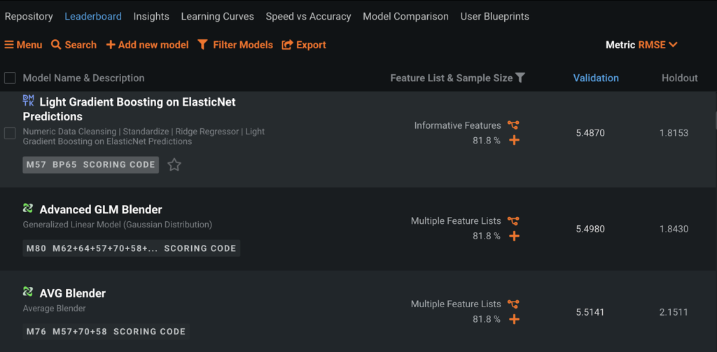 The SARCOS dataset is broken into two parts: a training dataset (sarcos_inv) and a test dataset (sarcos_inv_test). Following common data science practices, DataRobot broke the SARCOS training set into a training partition and a validation partition. I treated the SARCOS test set (sarcos_inv_test) as a holdout. When I looked at the results, I immediately noticed something suspicious. Do you see it?