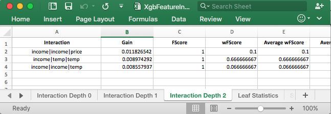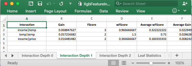 After the application runs, it will write out an excel spreadsheet titled: XgbFeatureInteractions.xlsx. This spreadsheet has the good stuff! Open up the spreadsheet and you should see: